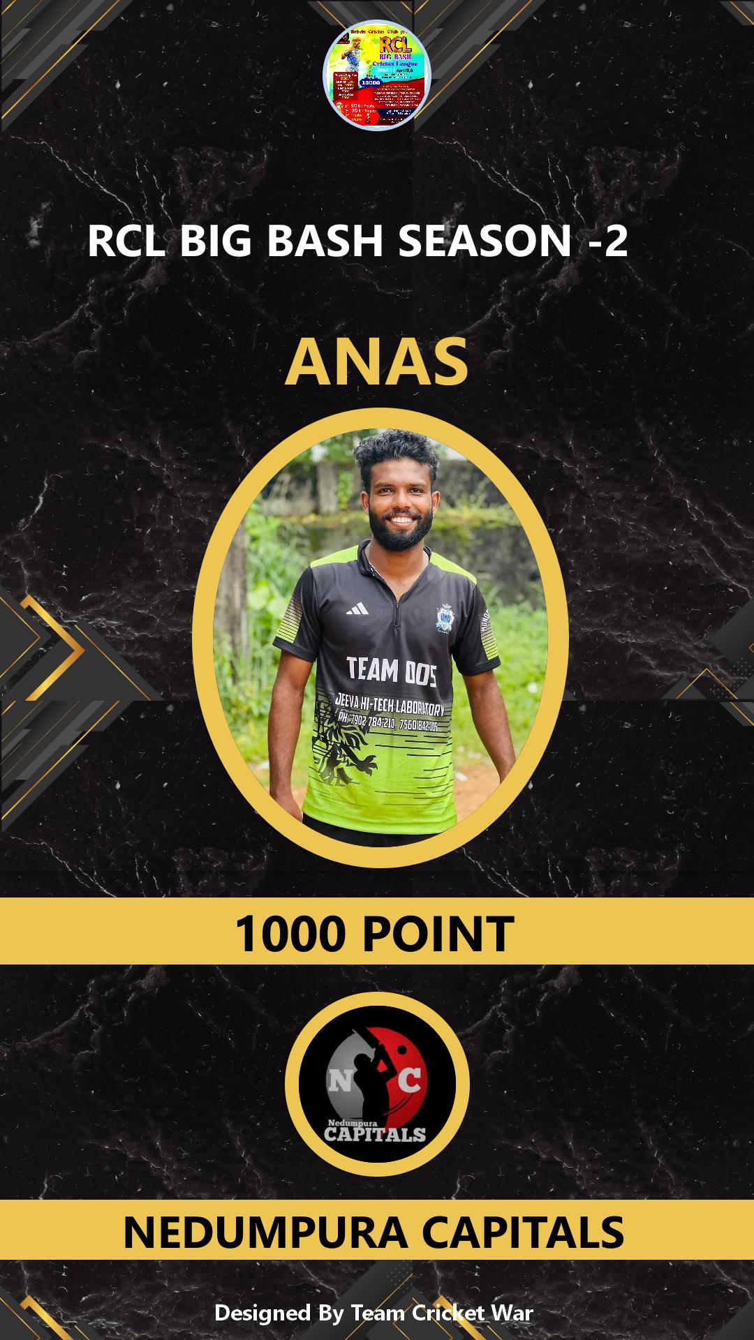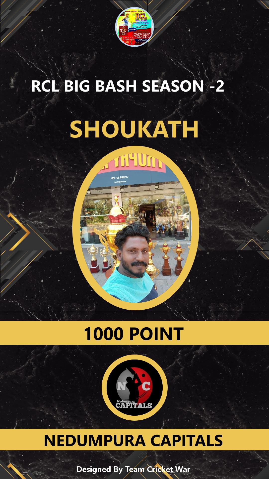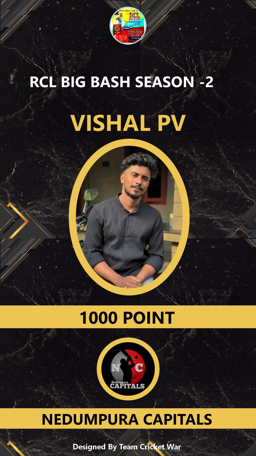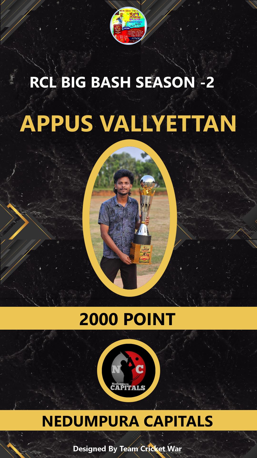 ALLROUNDER, AGE : 25 CHELAKKA Bid Amount : 1000 Team : NEDUMPURA CAPITALS Download ID Card VIEW PROFILE |