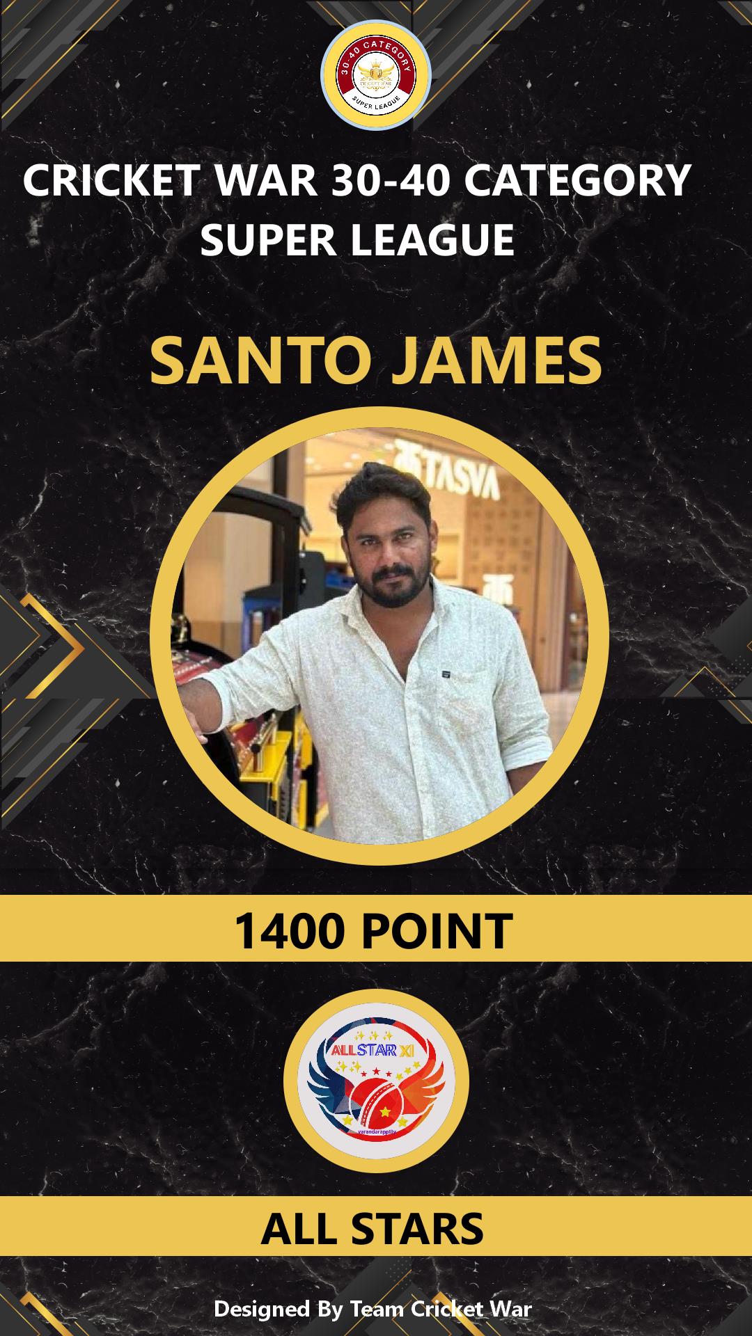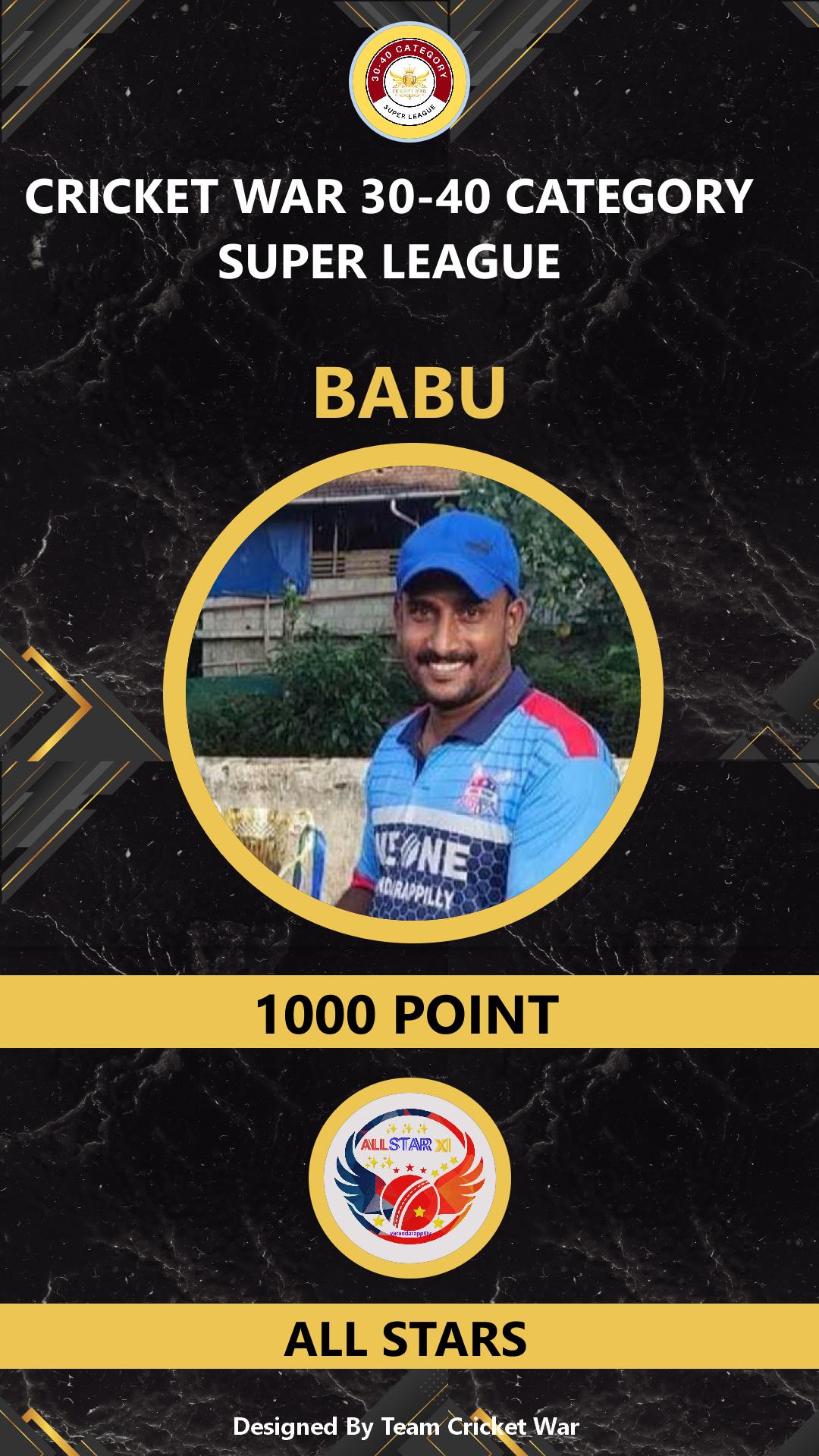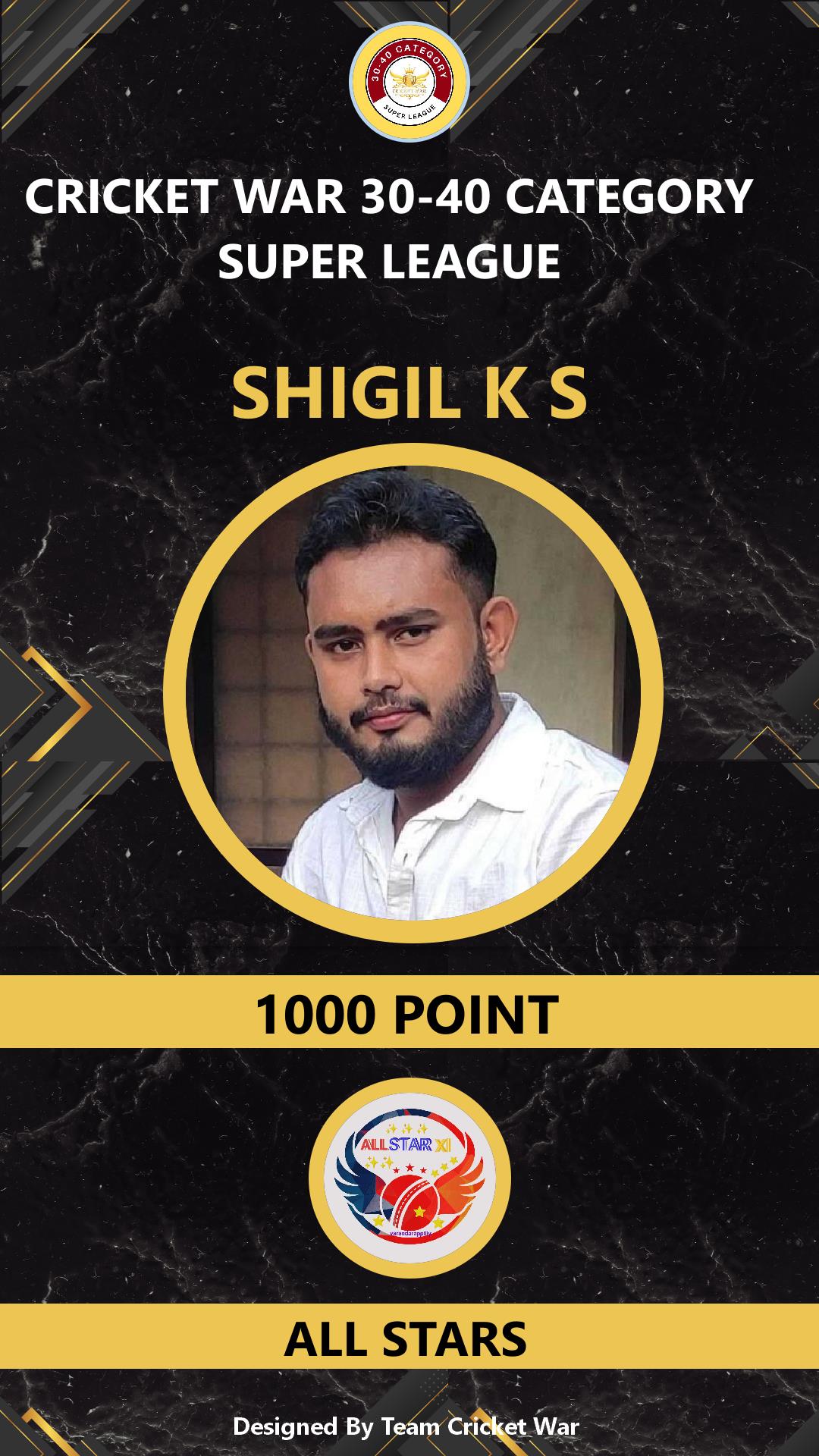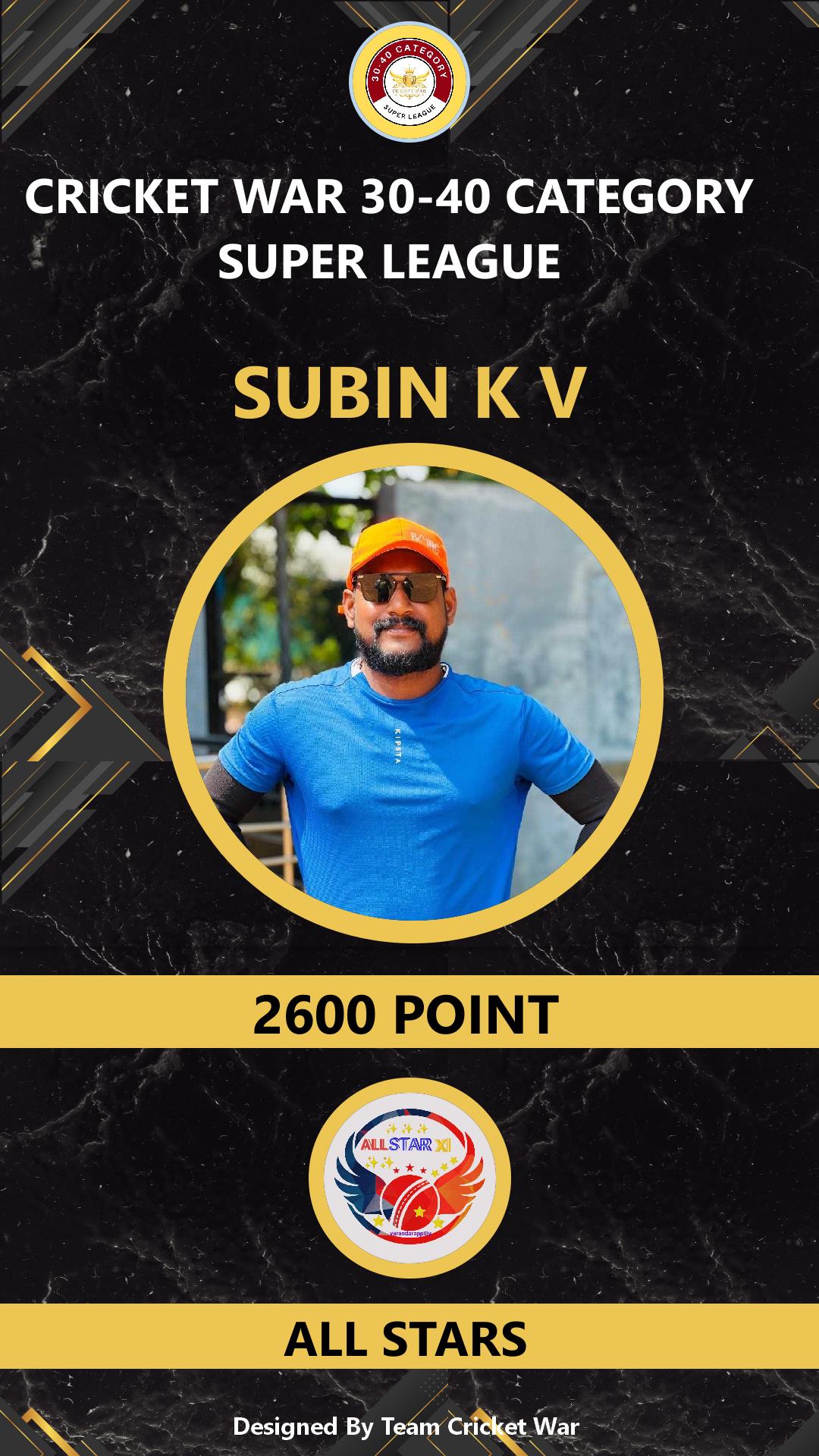 ALLROUNDER, AGE : 37 VARANDARAPPILLY Bid Amount : 1000 Team : ALL STARS Download ID Card VIEW PROFILE |