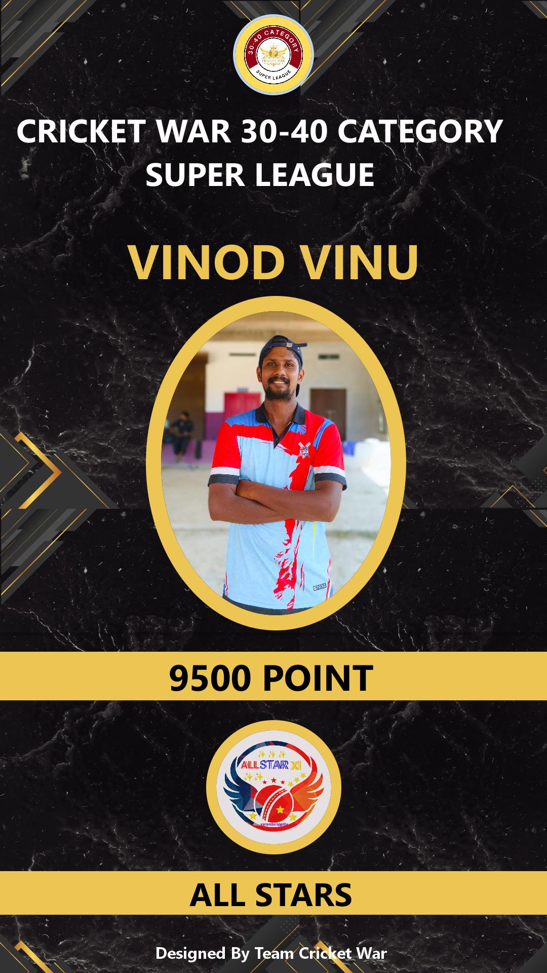 ALLROUNDER, AGE : 38 VARANDARAPPILLY Bid Amount : 7500 Team : ALL STARS Download ID Card VIEW PROFILE |