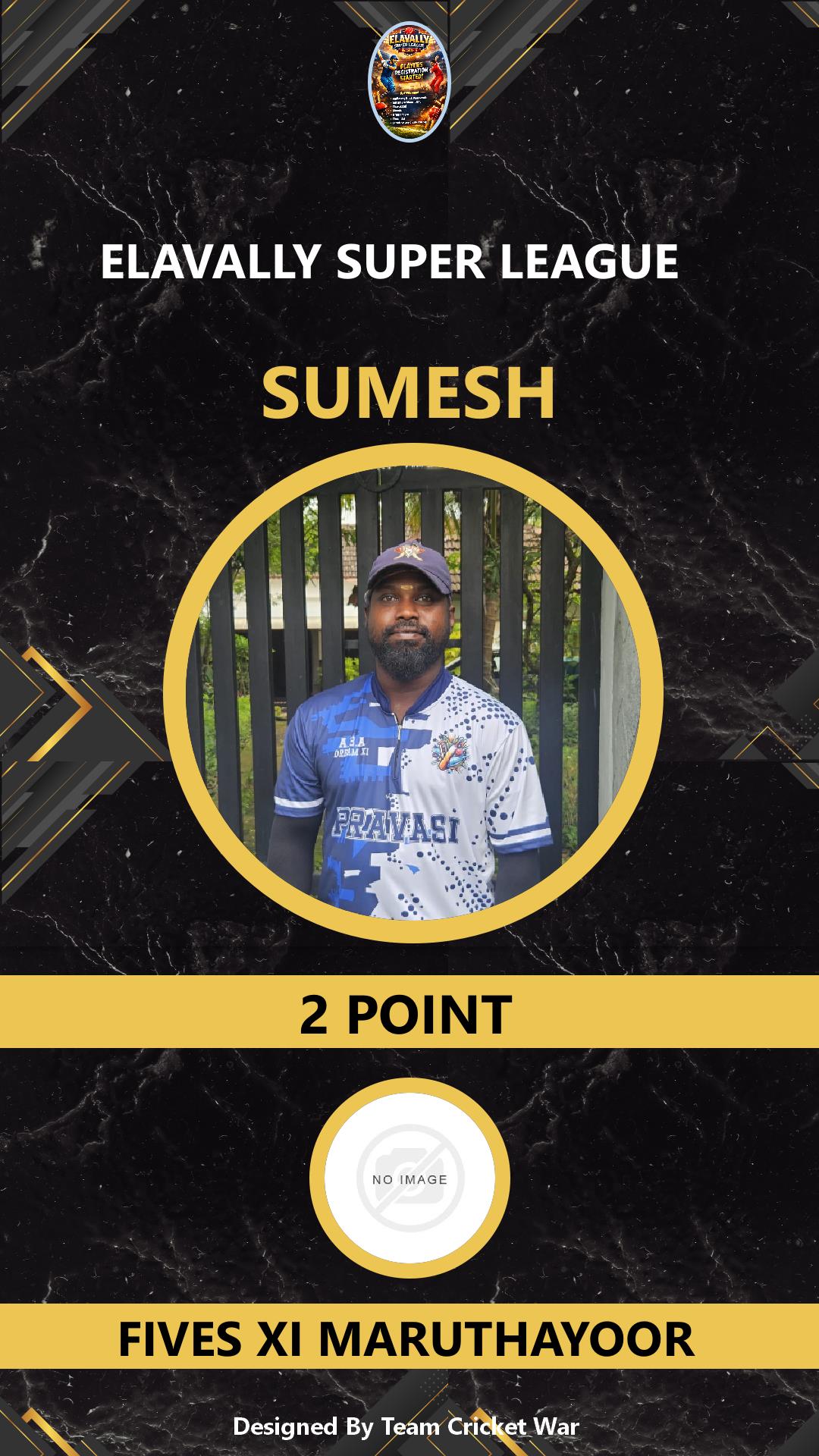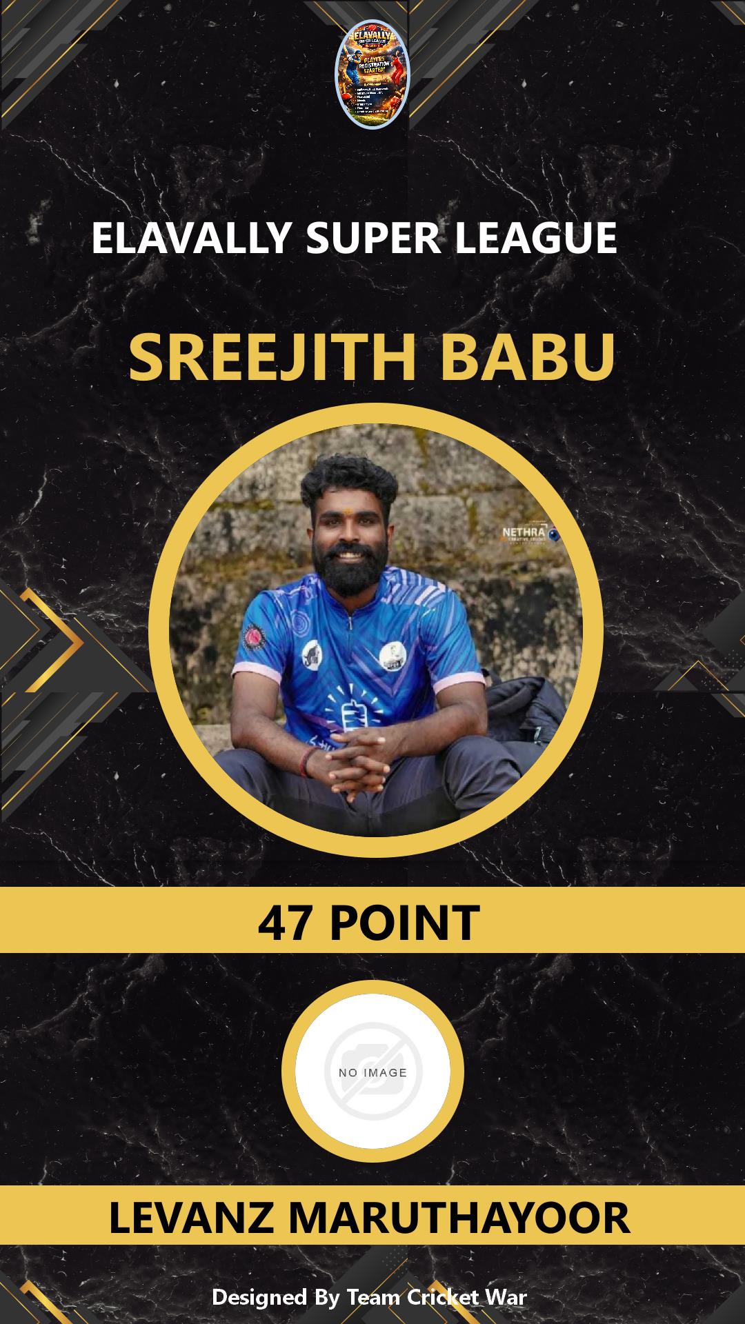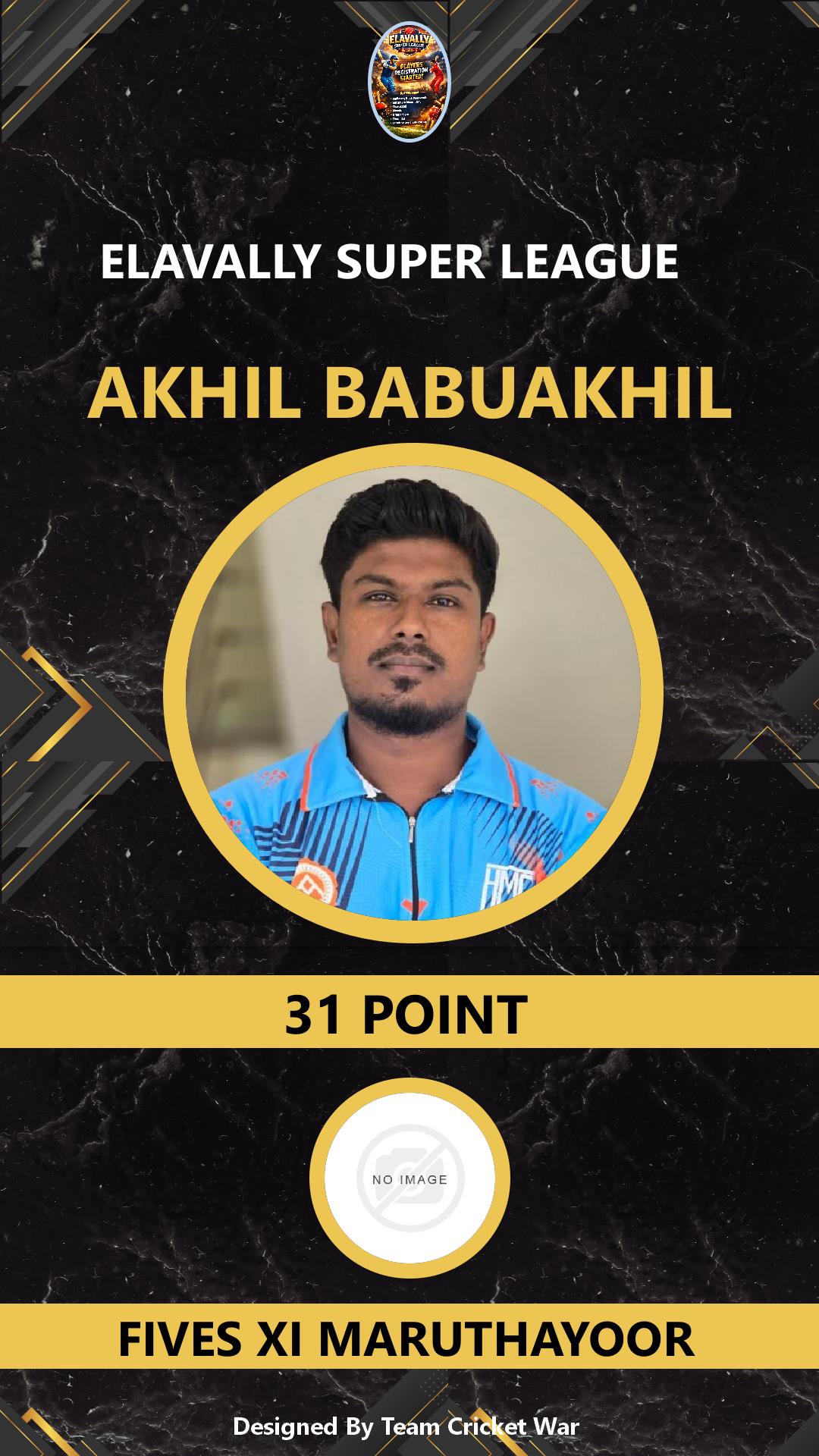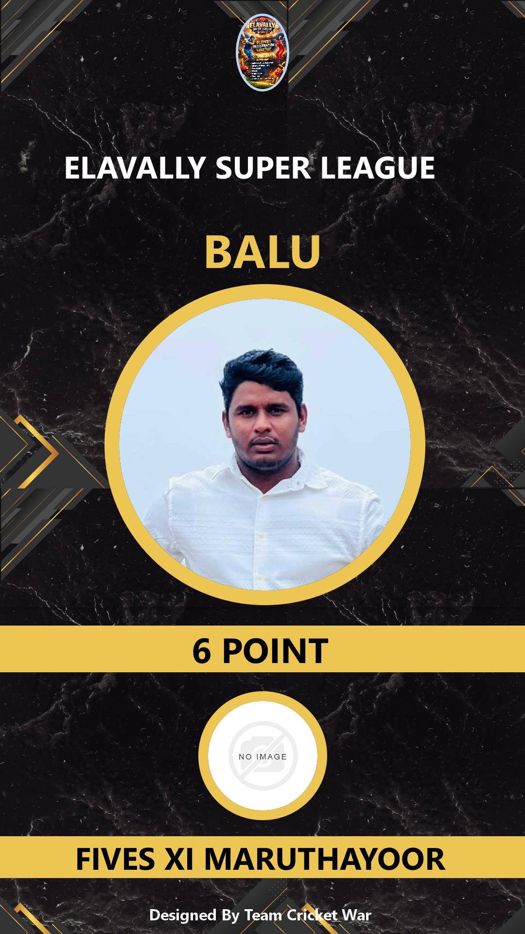 ALLROUNDER, AGE : 33 MAMABAZAR Bid Amount : 7 Team : FIVES XI MARUTHAYOOR Download ID Card VIEW PROFILE |