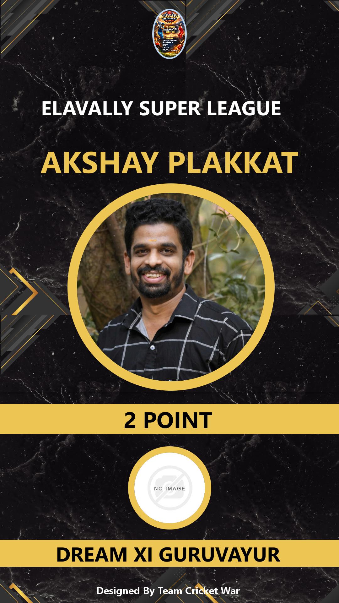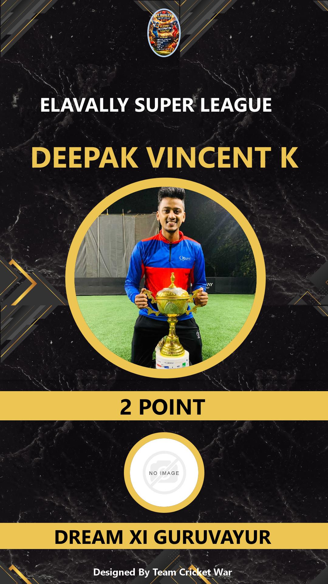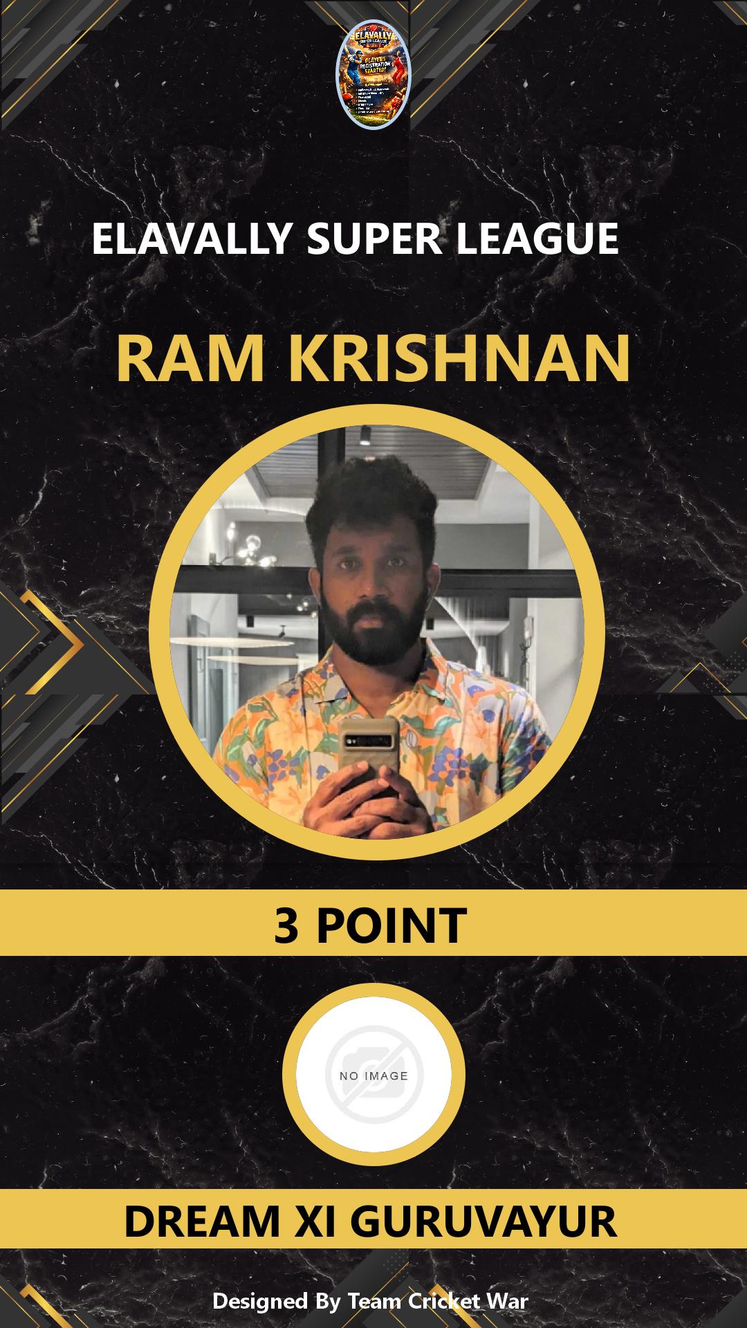 ALLROUNDER, AGE : 38 GURUVAYUR Bid Amount : 3 Team : DREAM XI GURUVAYUR Download ID Card VIEW PROFILE |