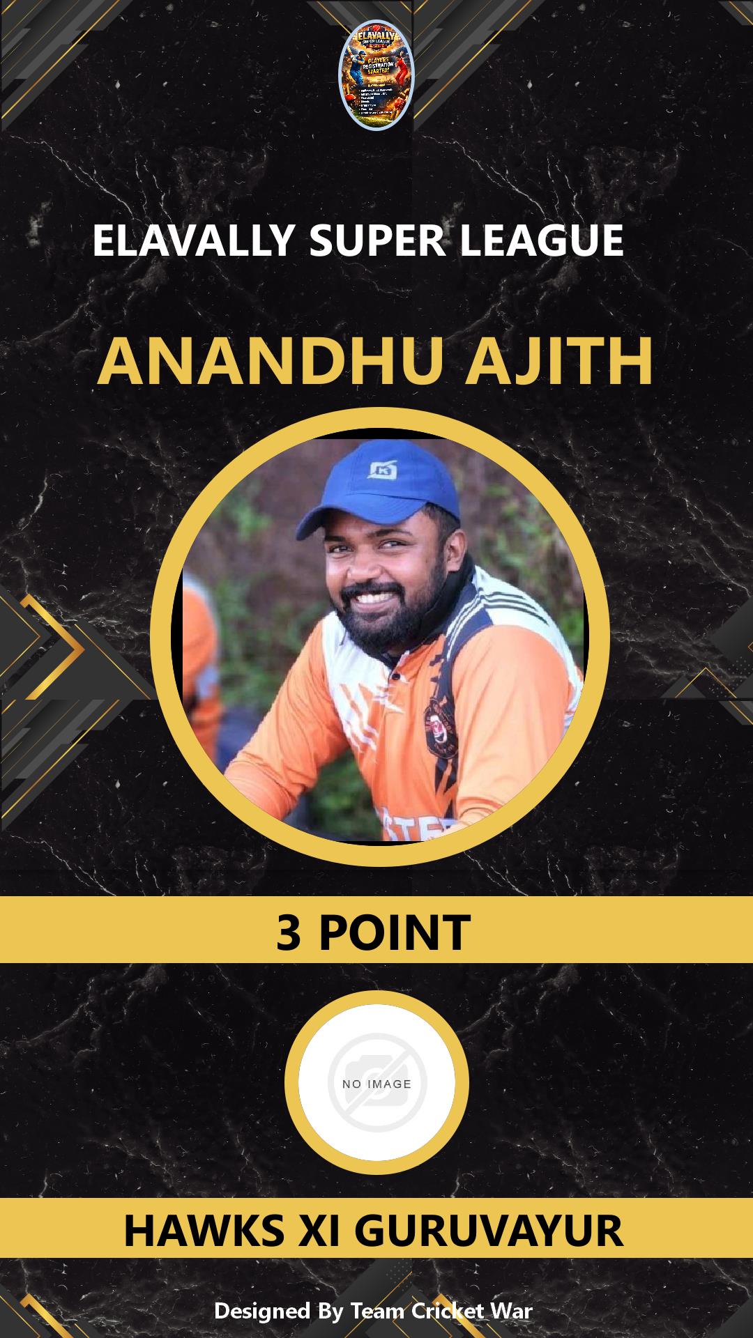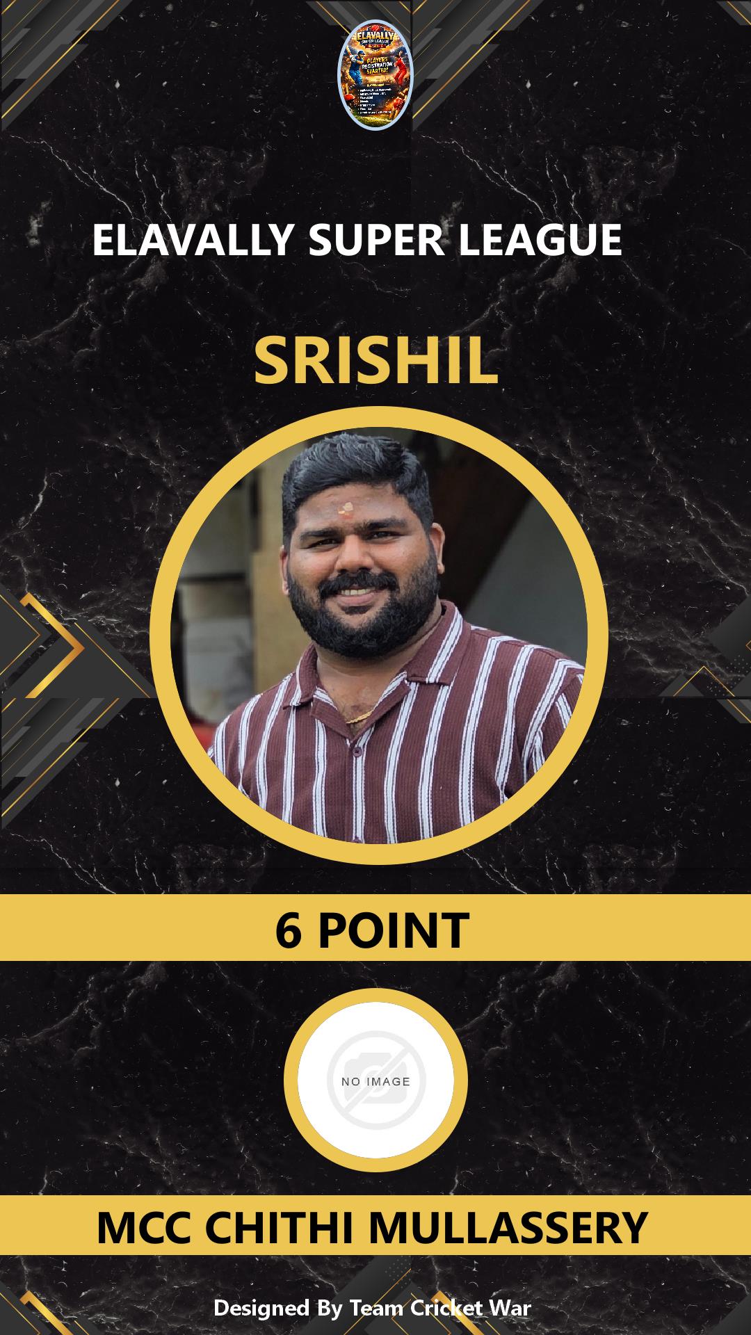 BATTING ALLROUNDER, AGE : 0 GURUVAYUR Bid Amount : 6 Team : FIVES XI MARUTHAYOOR Download ID Card VIEW PROFILE |