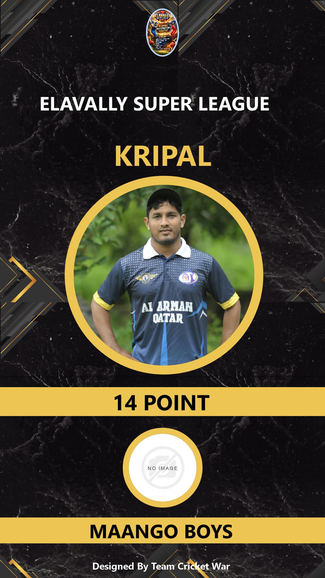 BATSMAN, AGE : 6 ELAVALLY Bid Amount : 13 Team : YORKERZ XI ELAVALLY Download ID Card VIEW PROFILE |