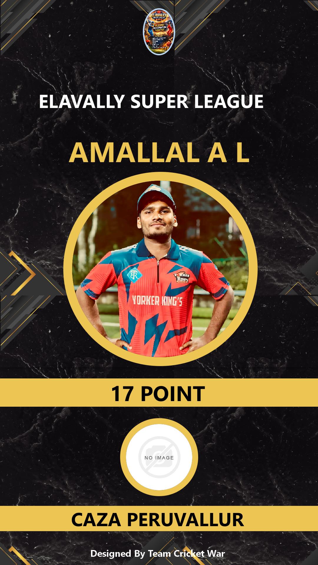 ALLROUNDER, AGE : 25 MANALUR Bid Amount : 17 Team : CAZA PERUVALLUR Download ID Card VIEW PROFILE |