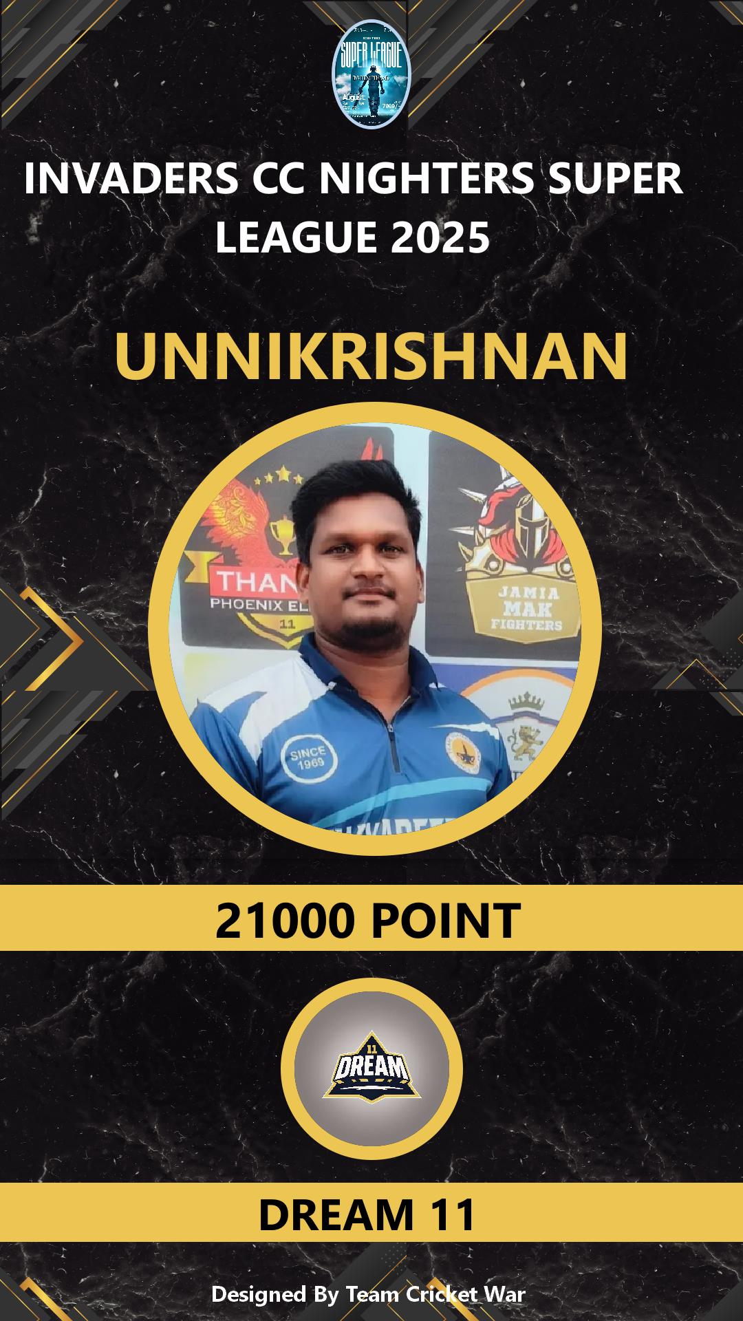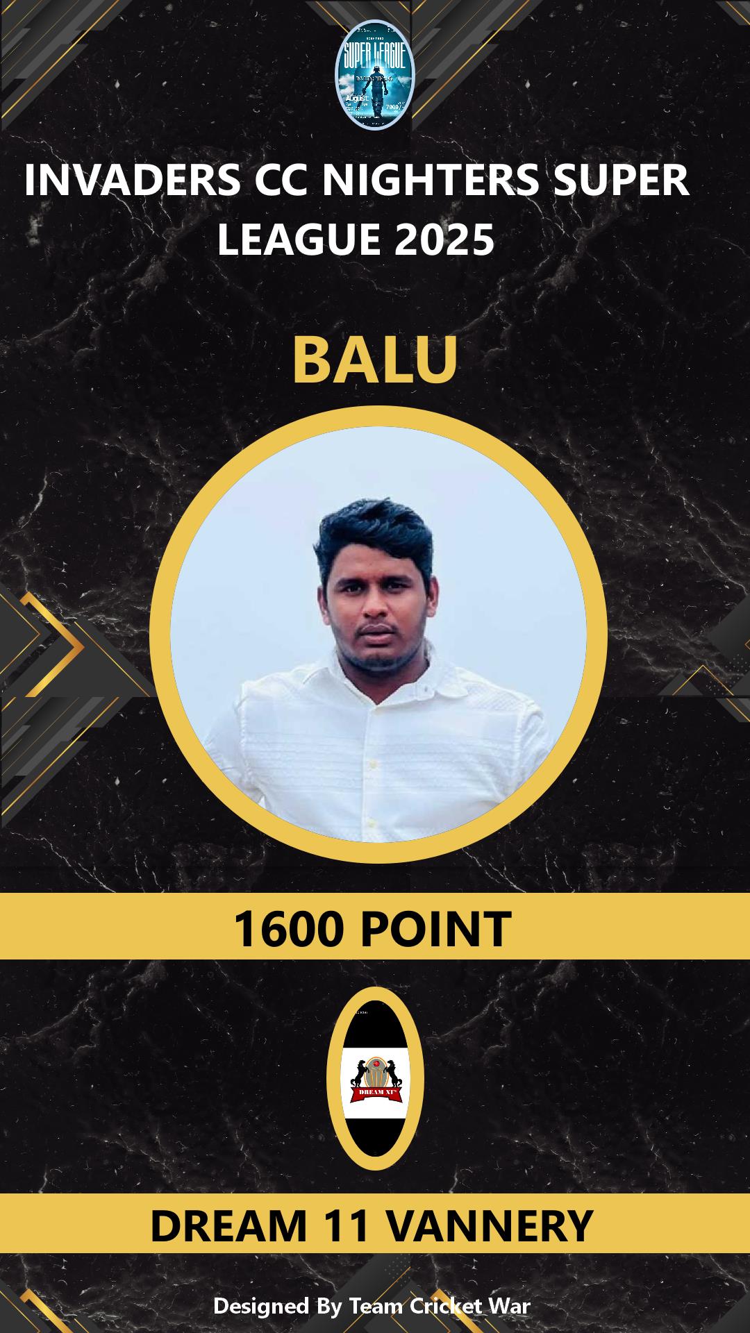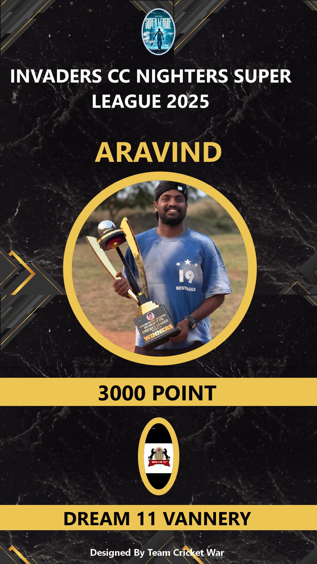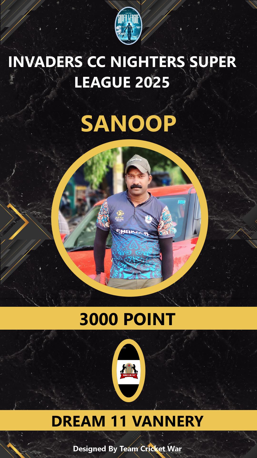 BATTING ALLROUNDER, AGE : 32 GURUVAYOOR Bid Amount : 1600 Team : DREAM 11 VANNERY Download ID Card VIEW PROFILE |