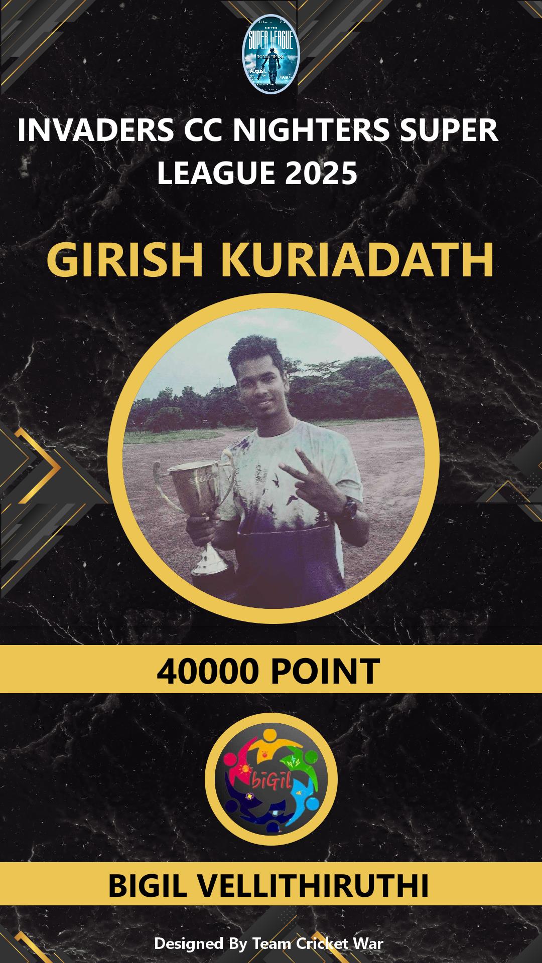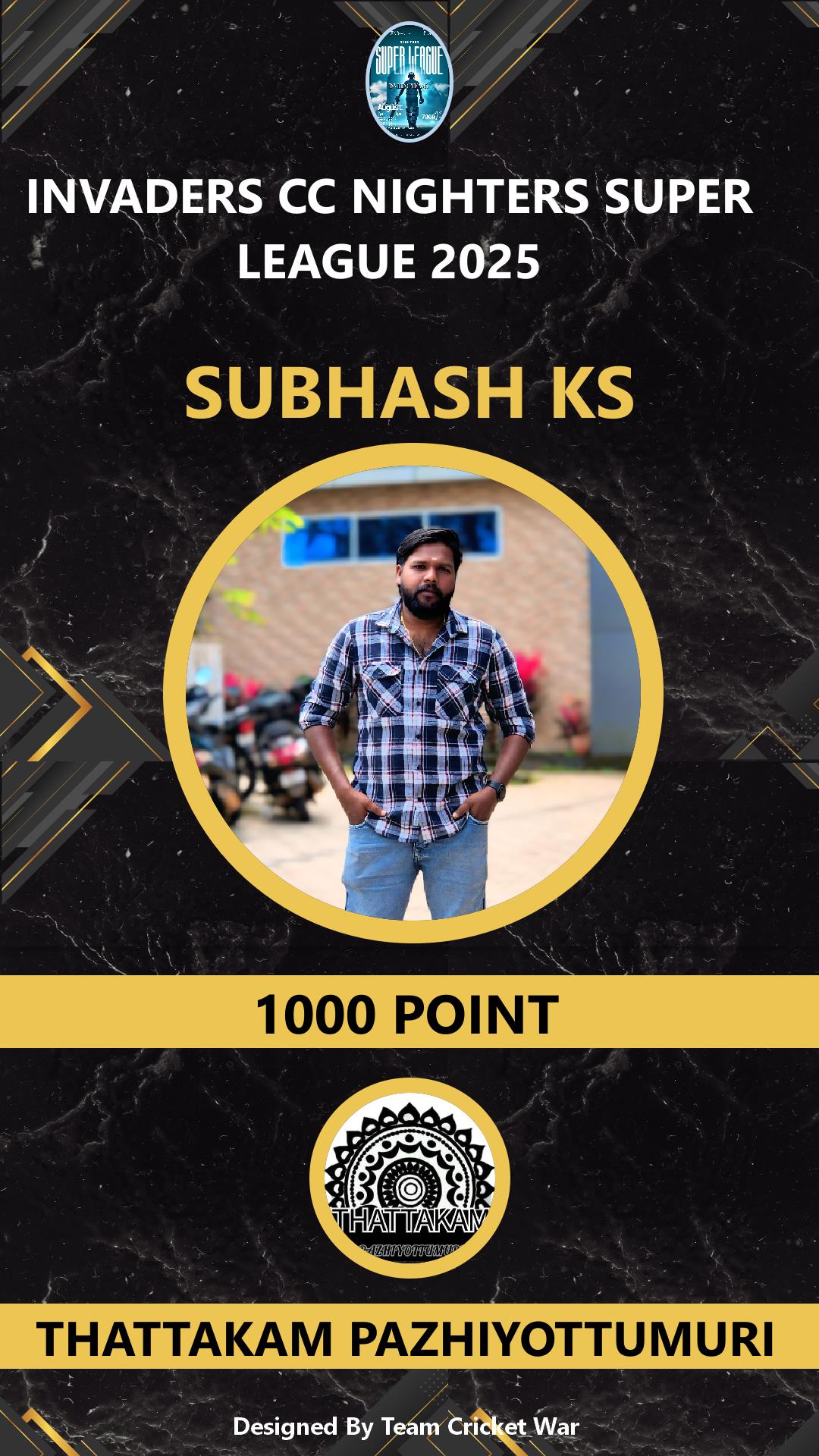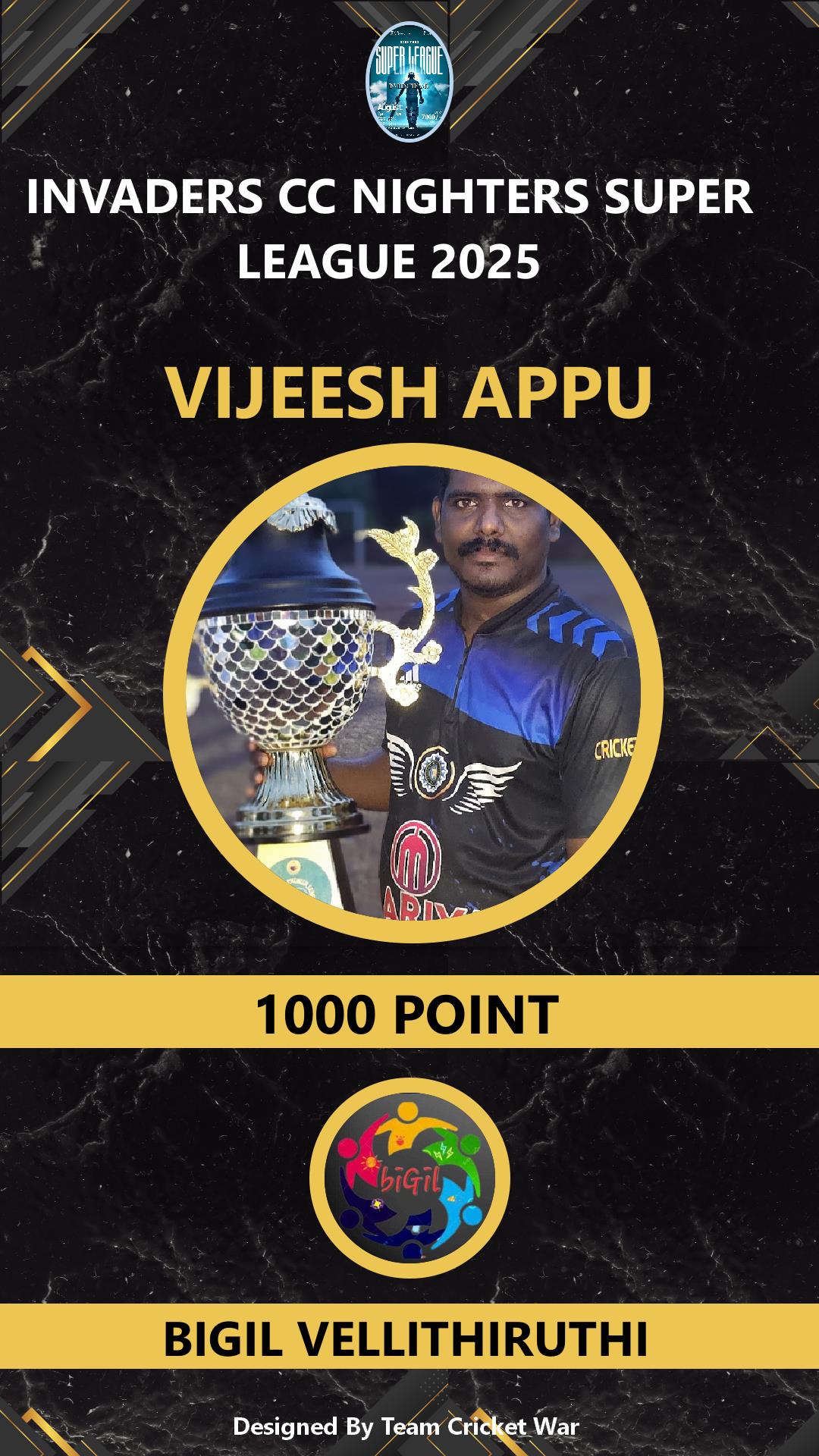 BATTING ALLROUNDER, AGE : 38 CHELAKKARA Bid Amount : 1000 Team : BIGIL VELLITHIRUTHI Download ID Card VIEW PROFILE |