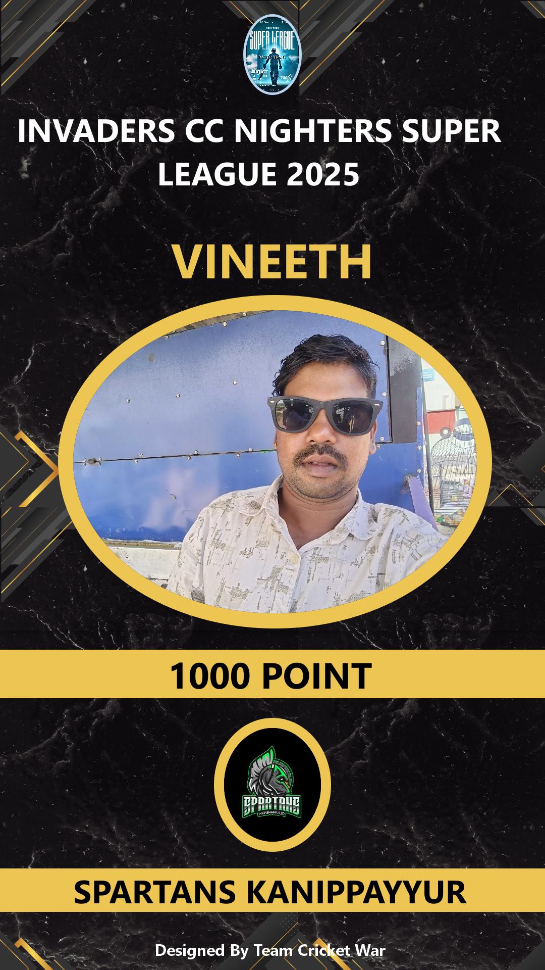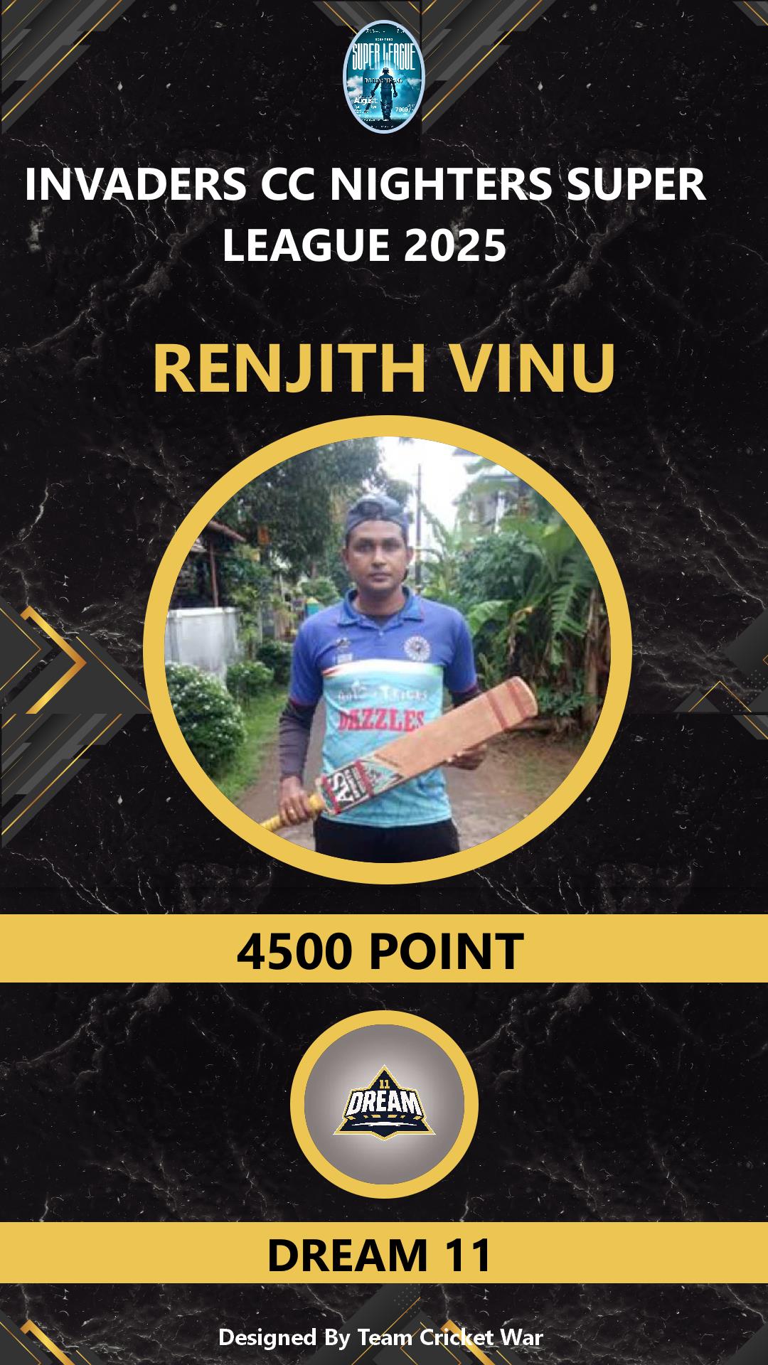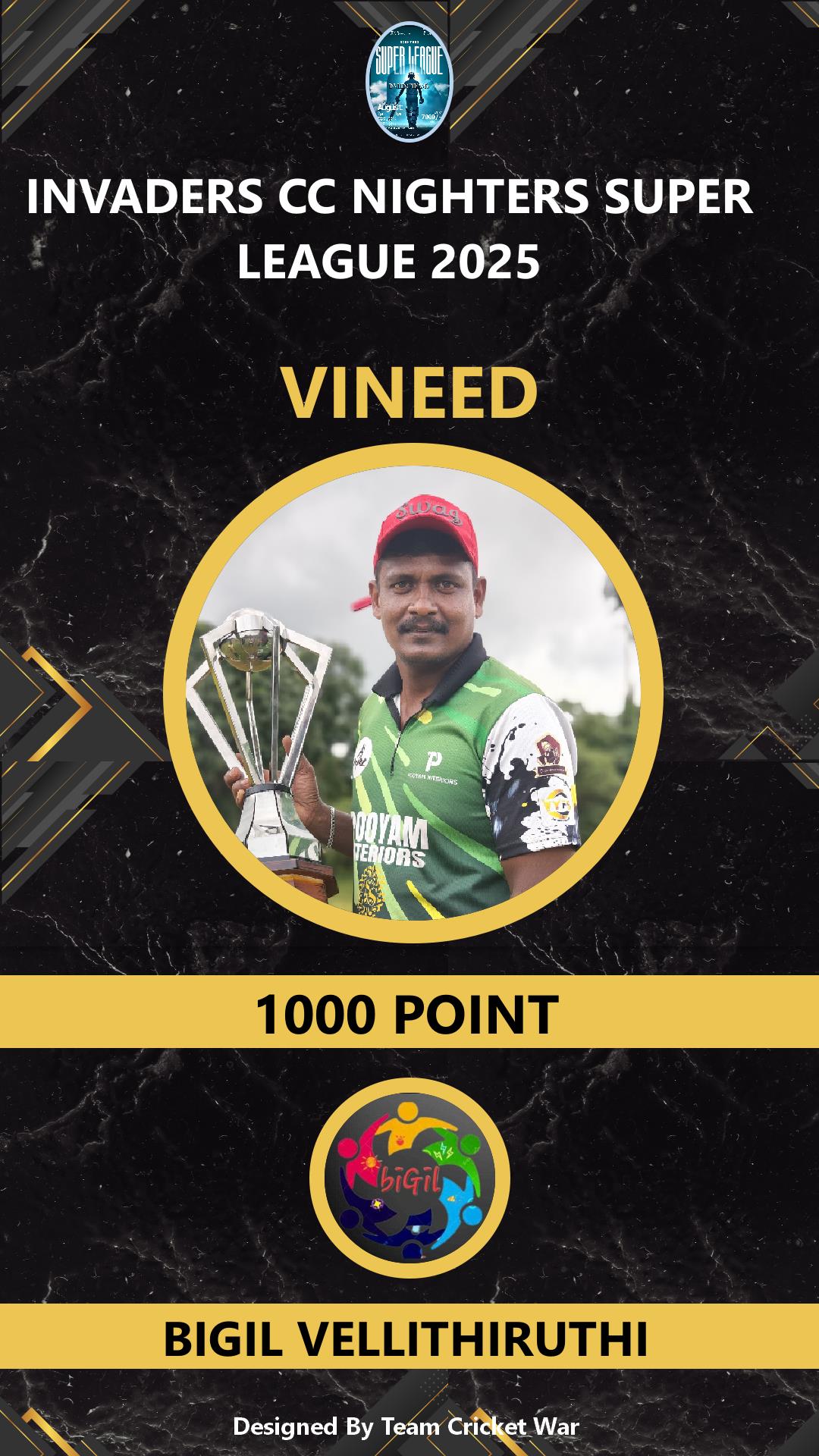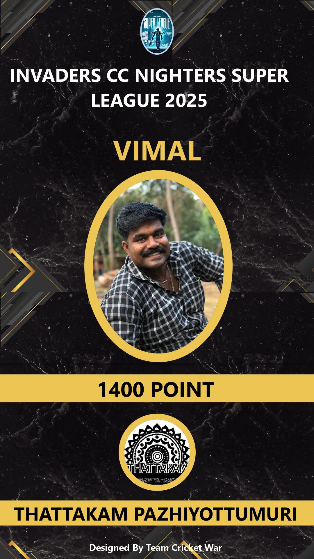 BOWLING ALLROUNDER, AGE : 20 VAZHANI Bid Amount : 1000 Team : DREAM 11 Download ID Card VIEW PROFILE |