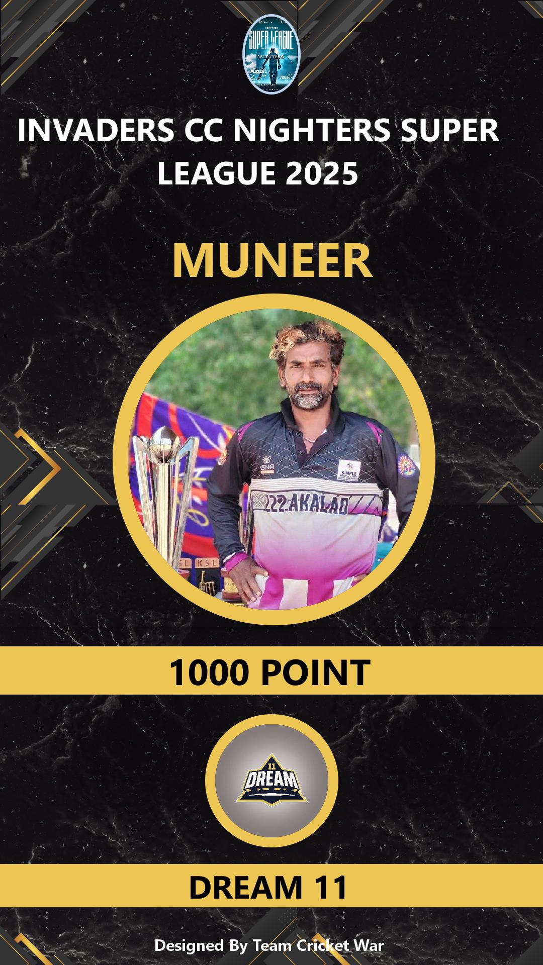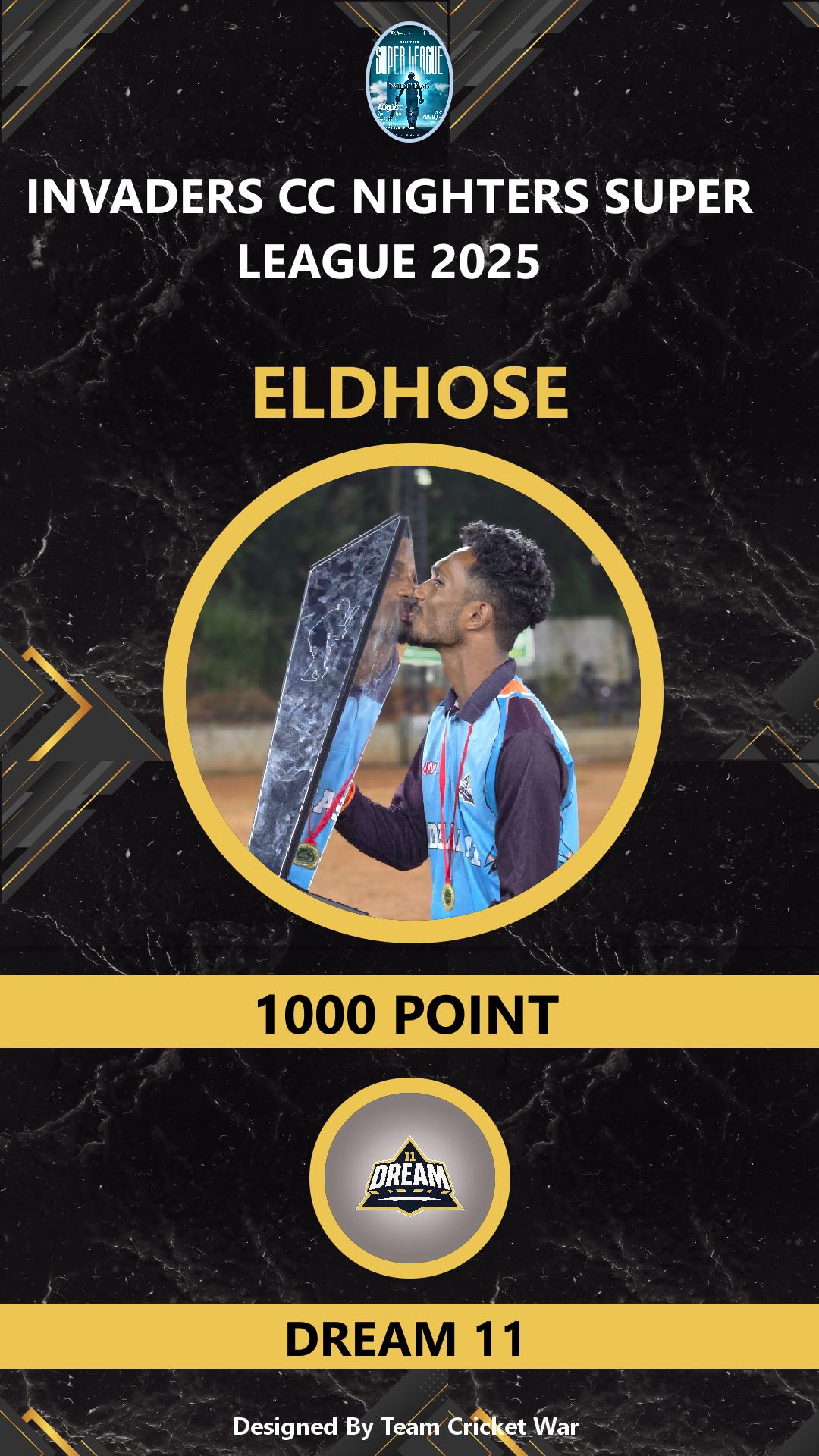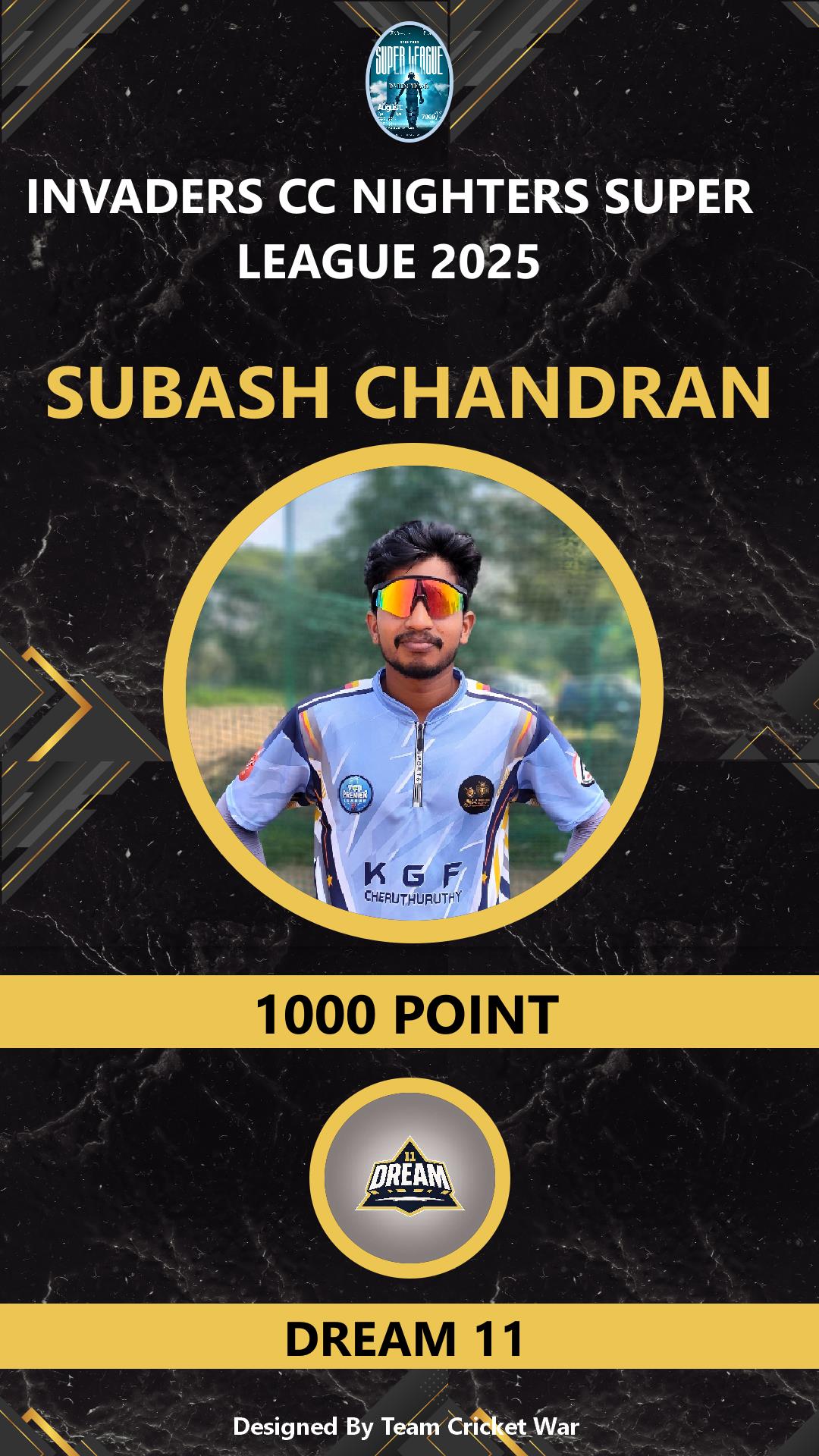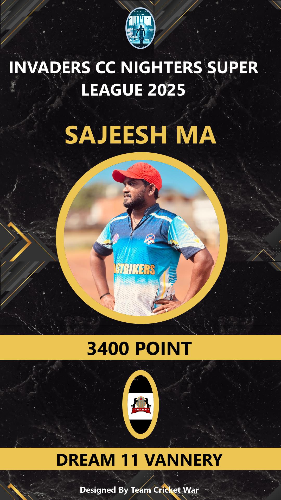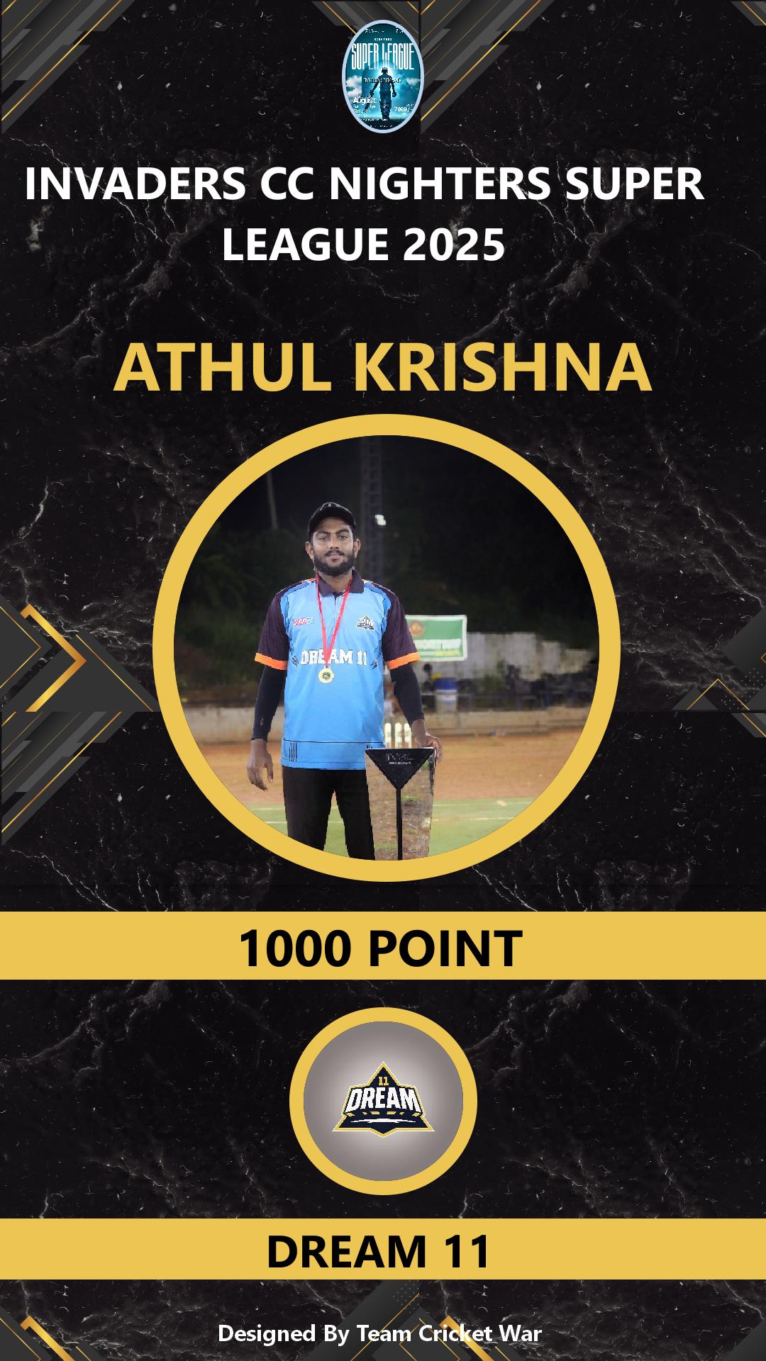BOWLING ALLROUNDER, AGE : 20 VAZHANI Bid Amount : 1000 Team : DREAM 11 Download ID Card VIEW PROFILE |