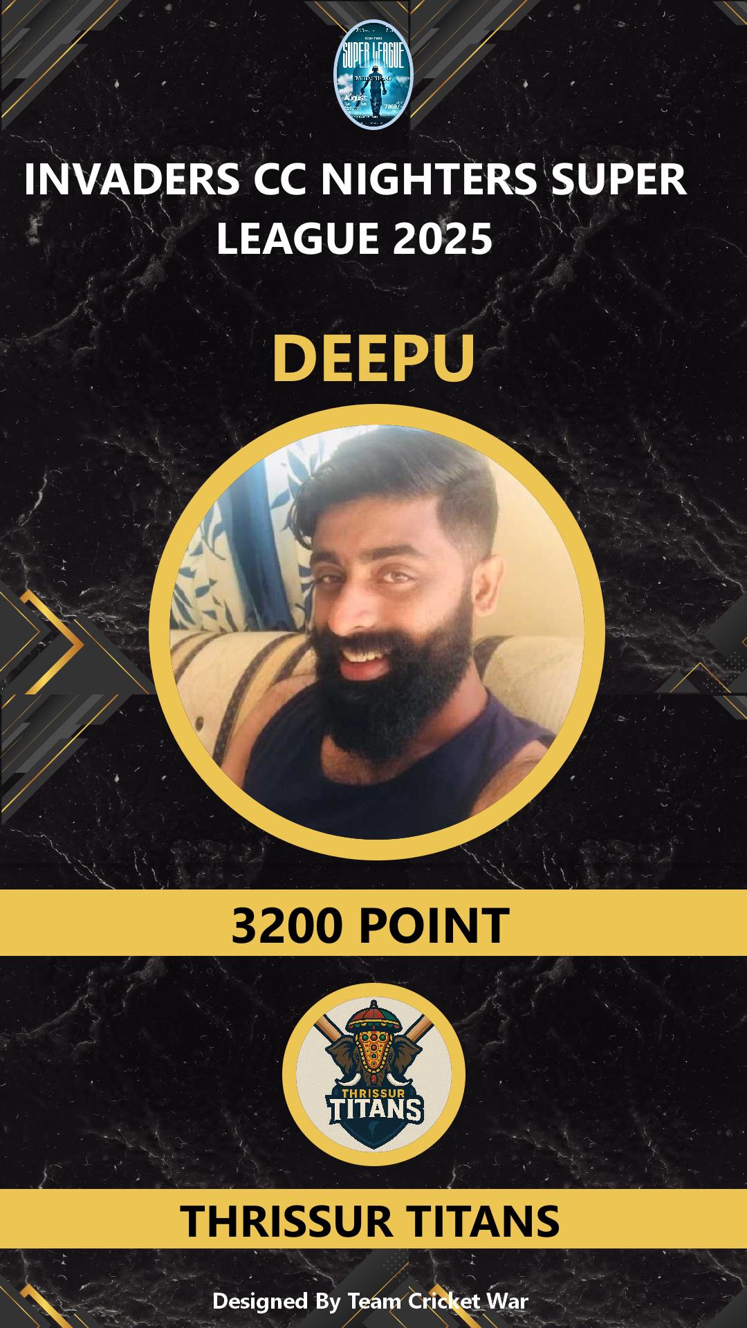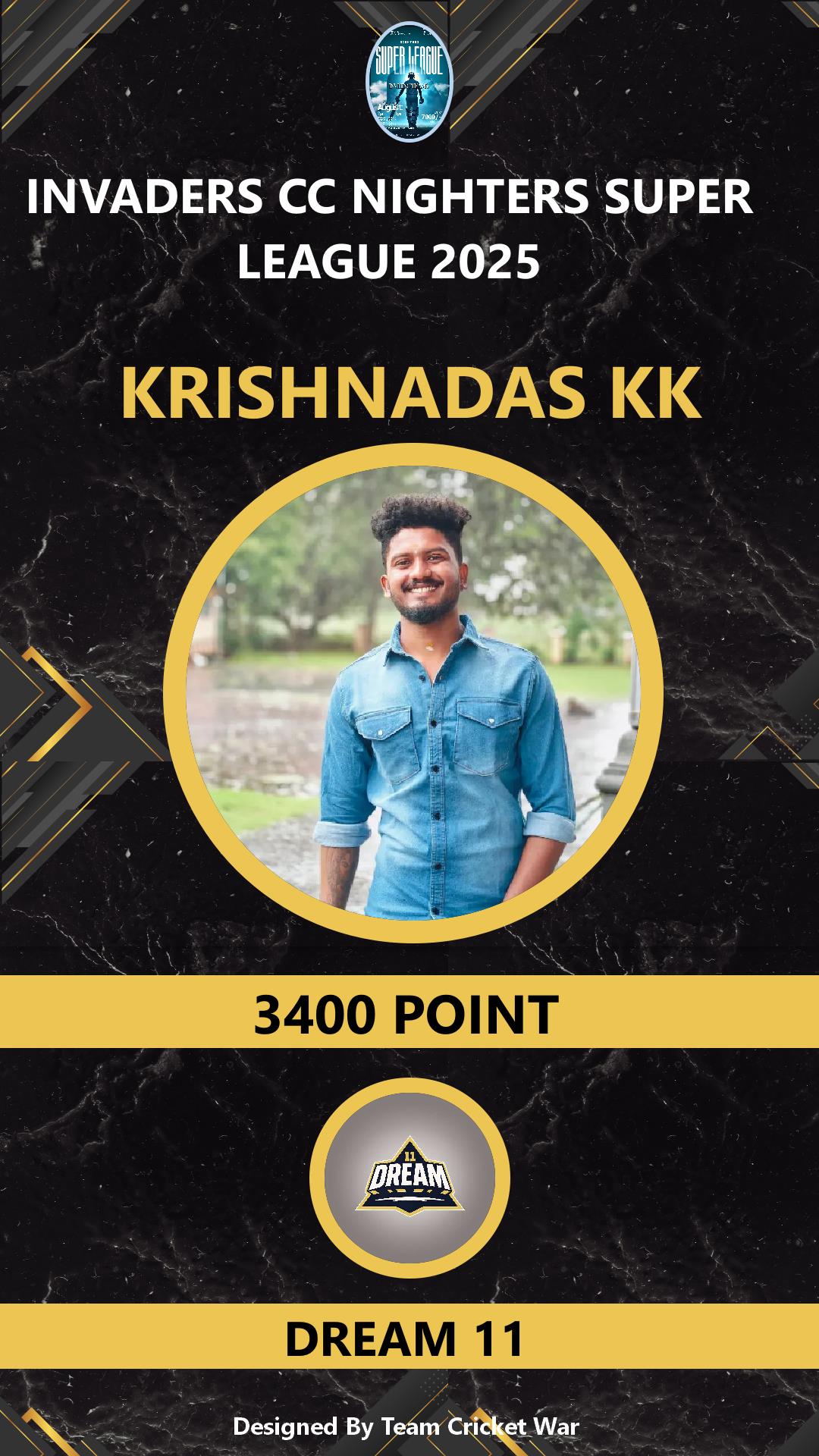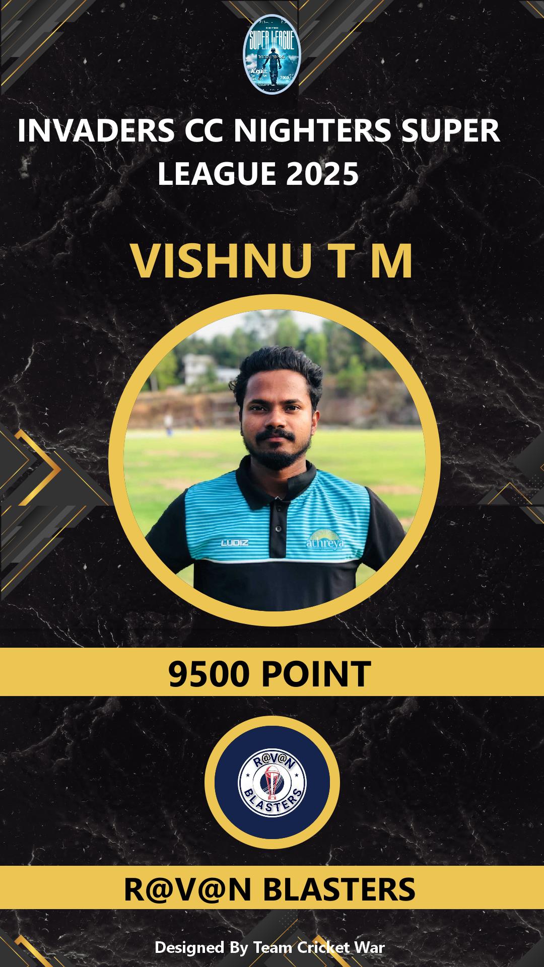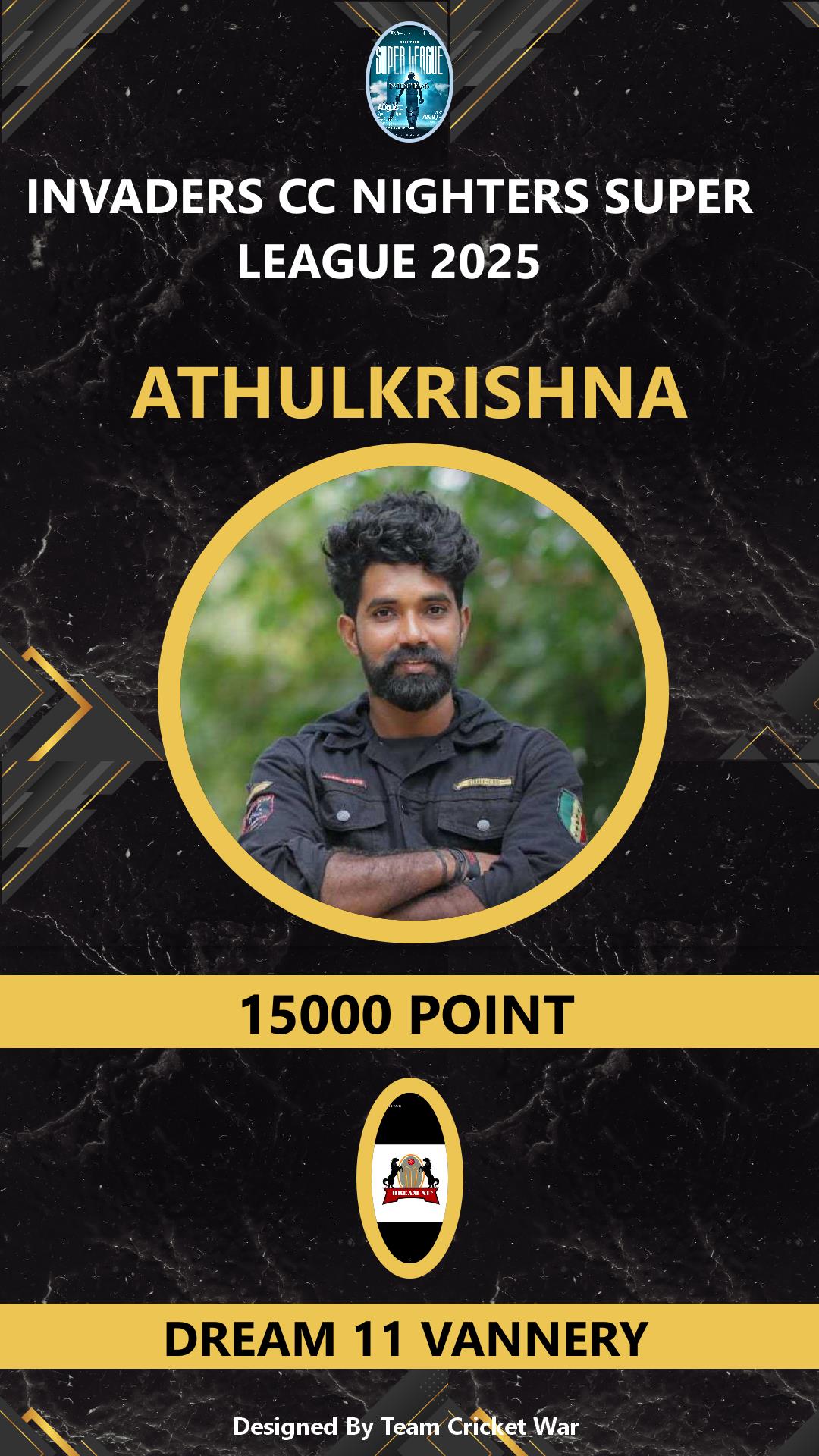 BOWLING ALLROUNDER, AGE : 20 GURUVAYUR Bid Amount : 3000 Team : DREAM 11 VANNERY Download ID Card VIEW PROFILE |