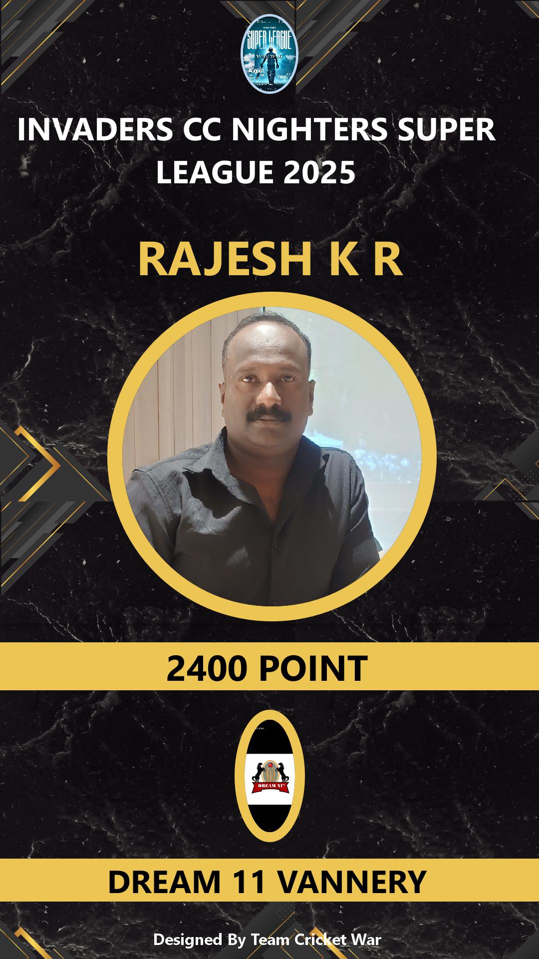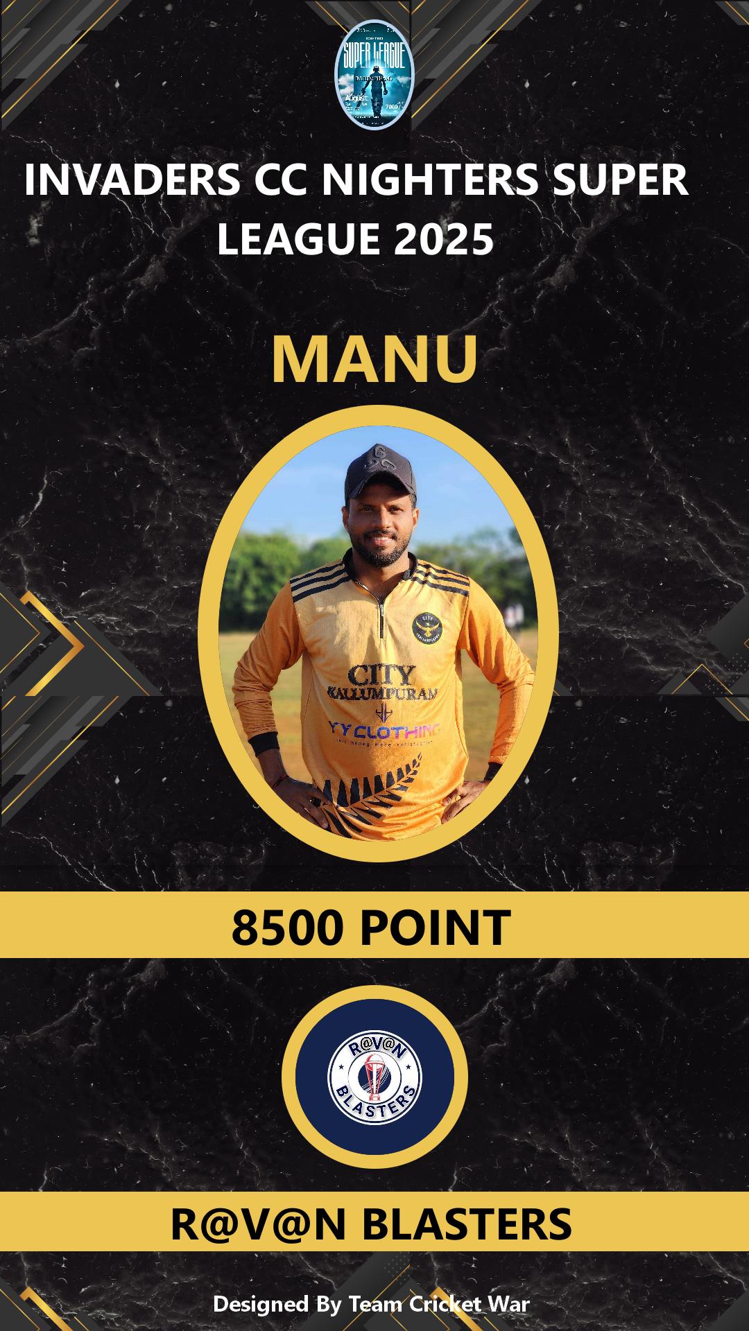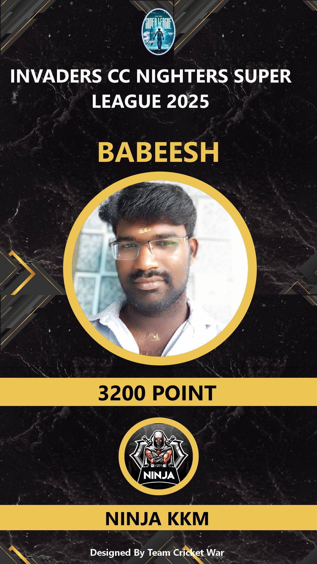 ALLROUNDER, AGE : 29 MANALUR Bid Amount : 1200 Team : NINJA KKM Download ID Card VIEW PROFILE |