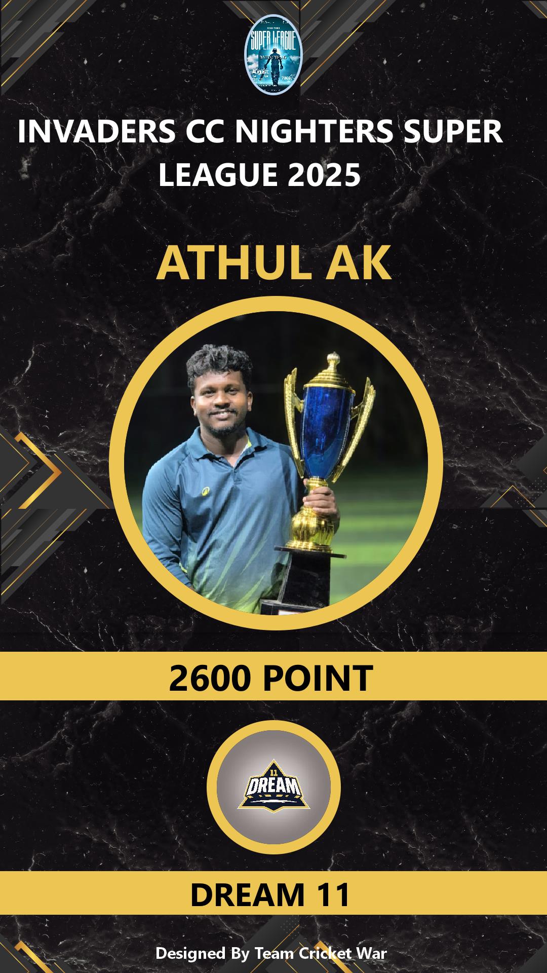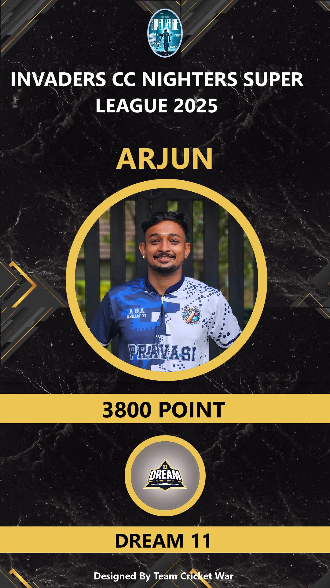 ALLROUNDER, AGE : 25 WADAKKANCHERY Bid Amount : 3800 Team : DREAM 11 Download ID Card VIEW PROFILE |