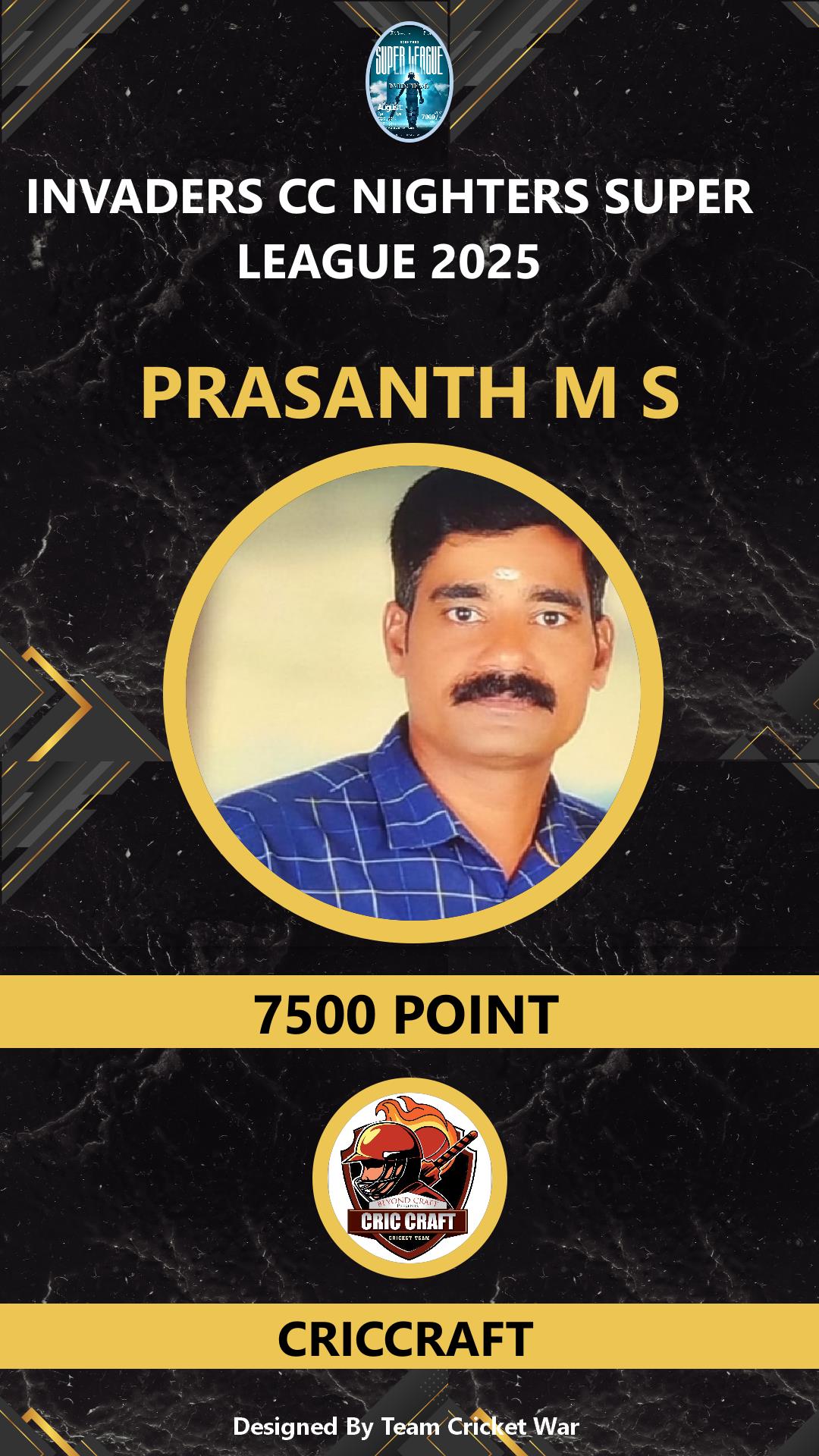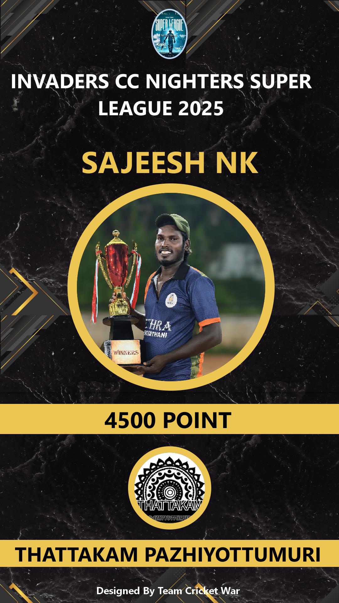 BOWLING ALLROUNDER, AGE : 32 MANALUR Bid Amount : 3000 Team : NINJA KKM Download ID Card VIEW PROFILE |