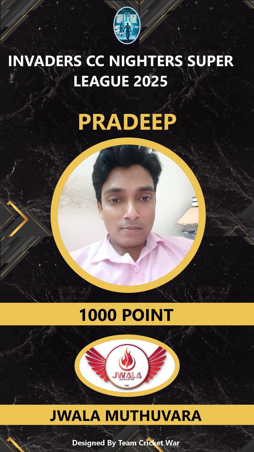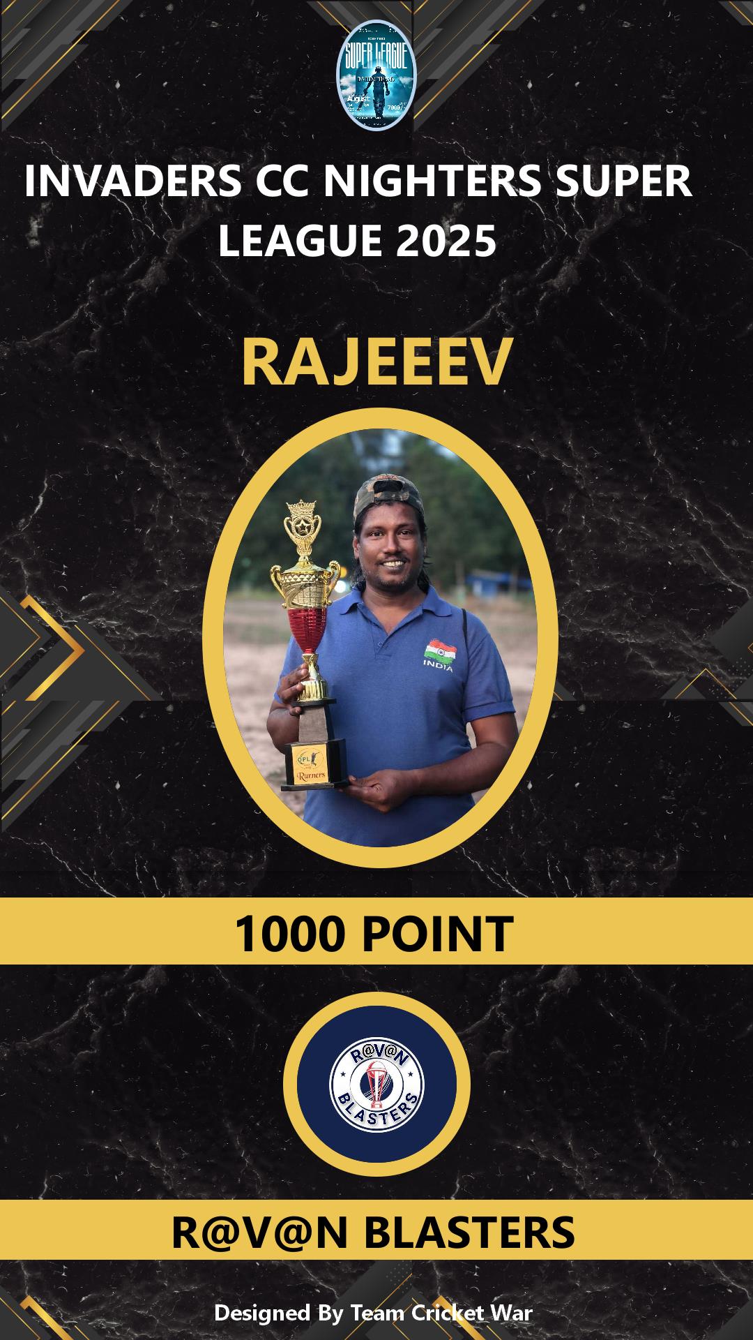 BATTING ALLROUNDER, AGE : 28 KADAVALLUR Bid Amount : 10000 Team : R@V@N BLASTERS Download ID Card VIEW PROFILE |