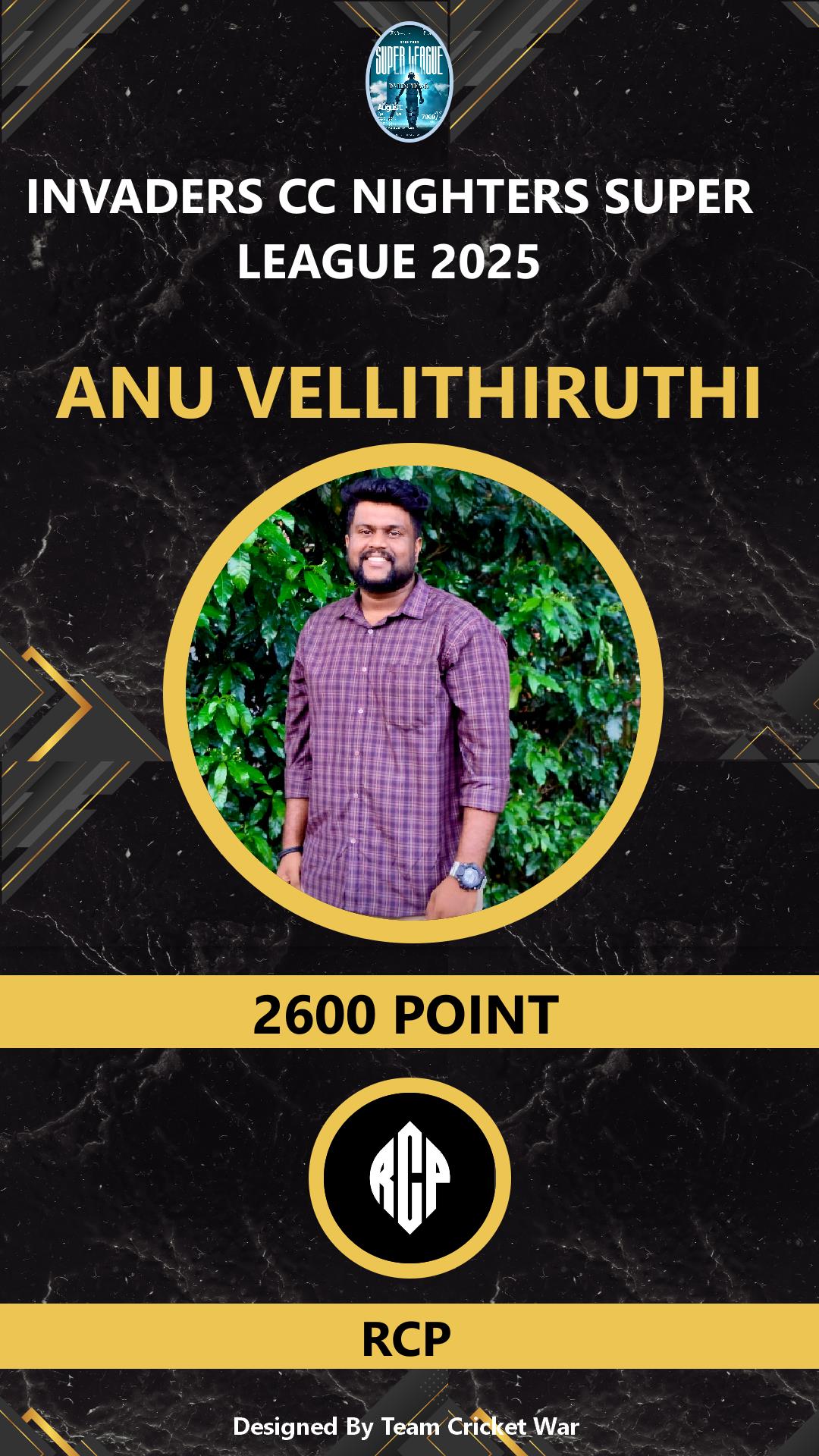 BATSMAN, AGE : 29 VELLITHIRUTHI Bid Amount : 2600 Team : RCP Download ID Card VIEW PROFILE |