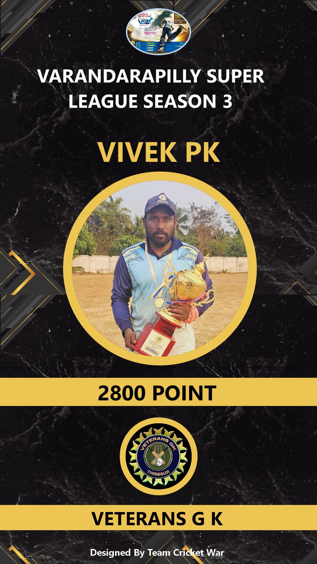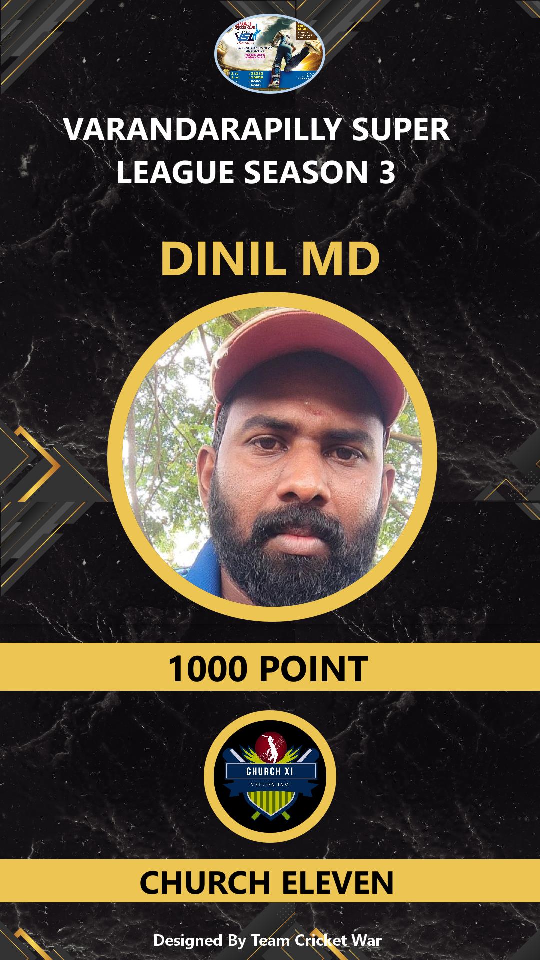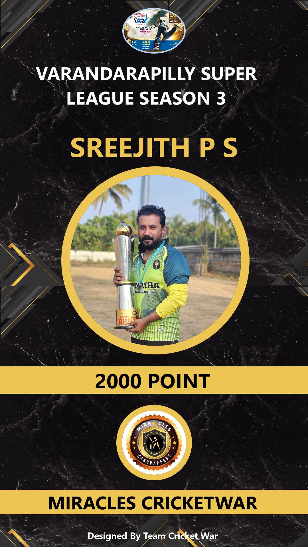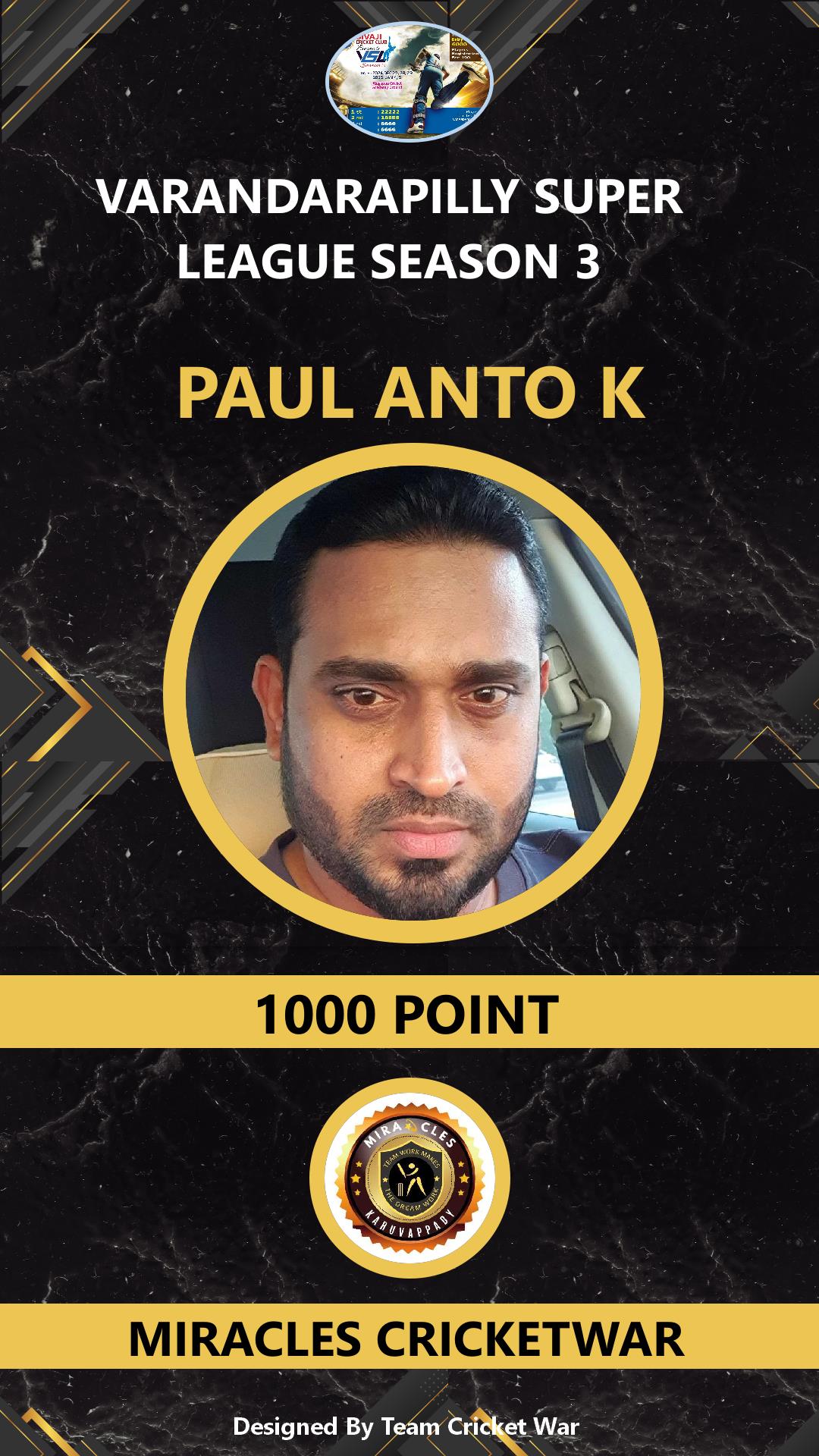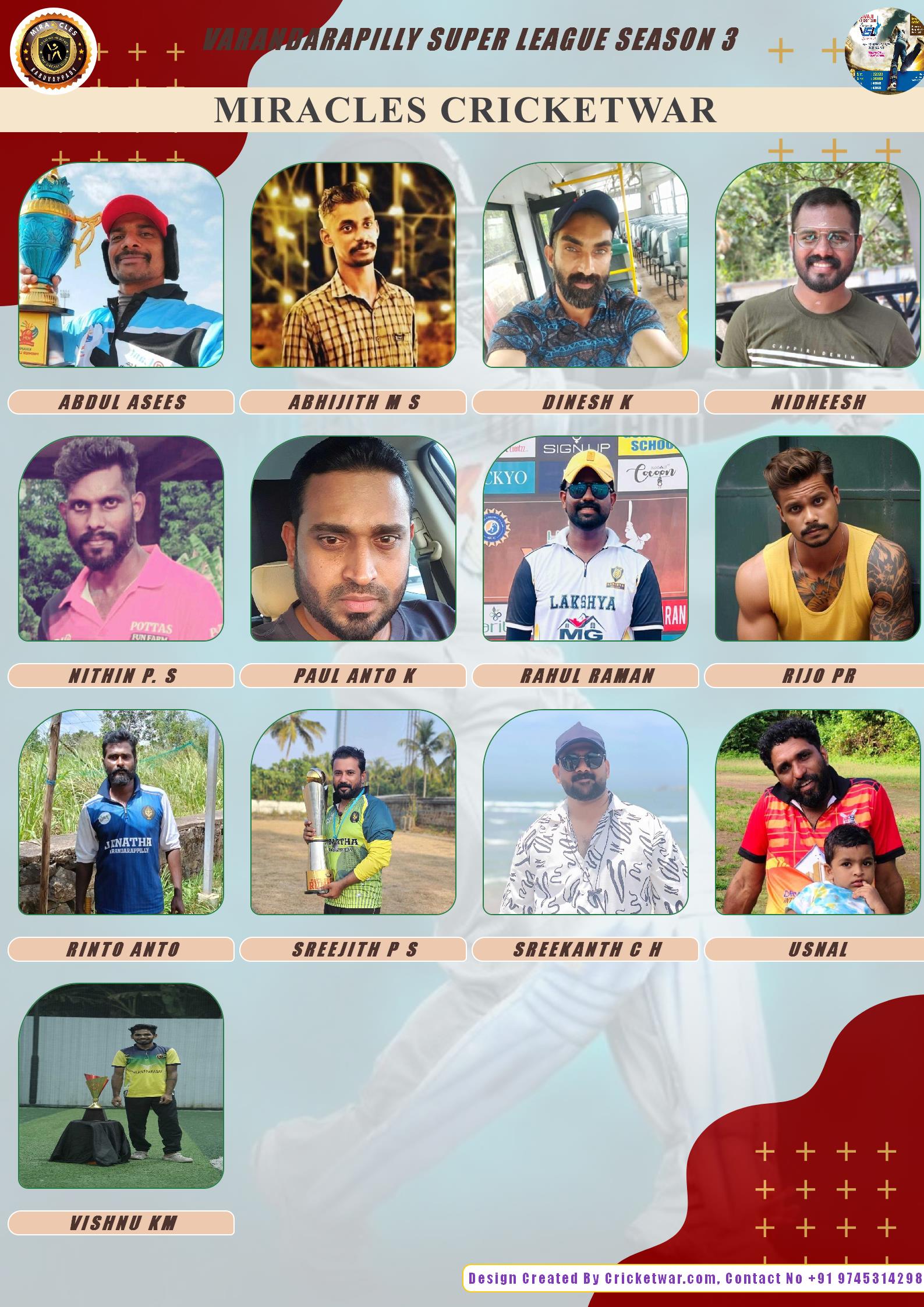 ALLROUNDER, AGE : 41 VARANDARAPPILLY Bid Amount : 2000 Team : MIRACLES CRICKETWAR Download ID Card VIEW PROFILE |