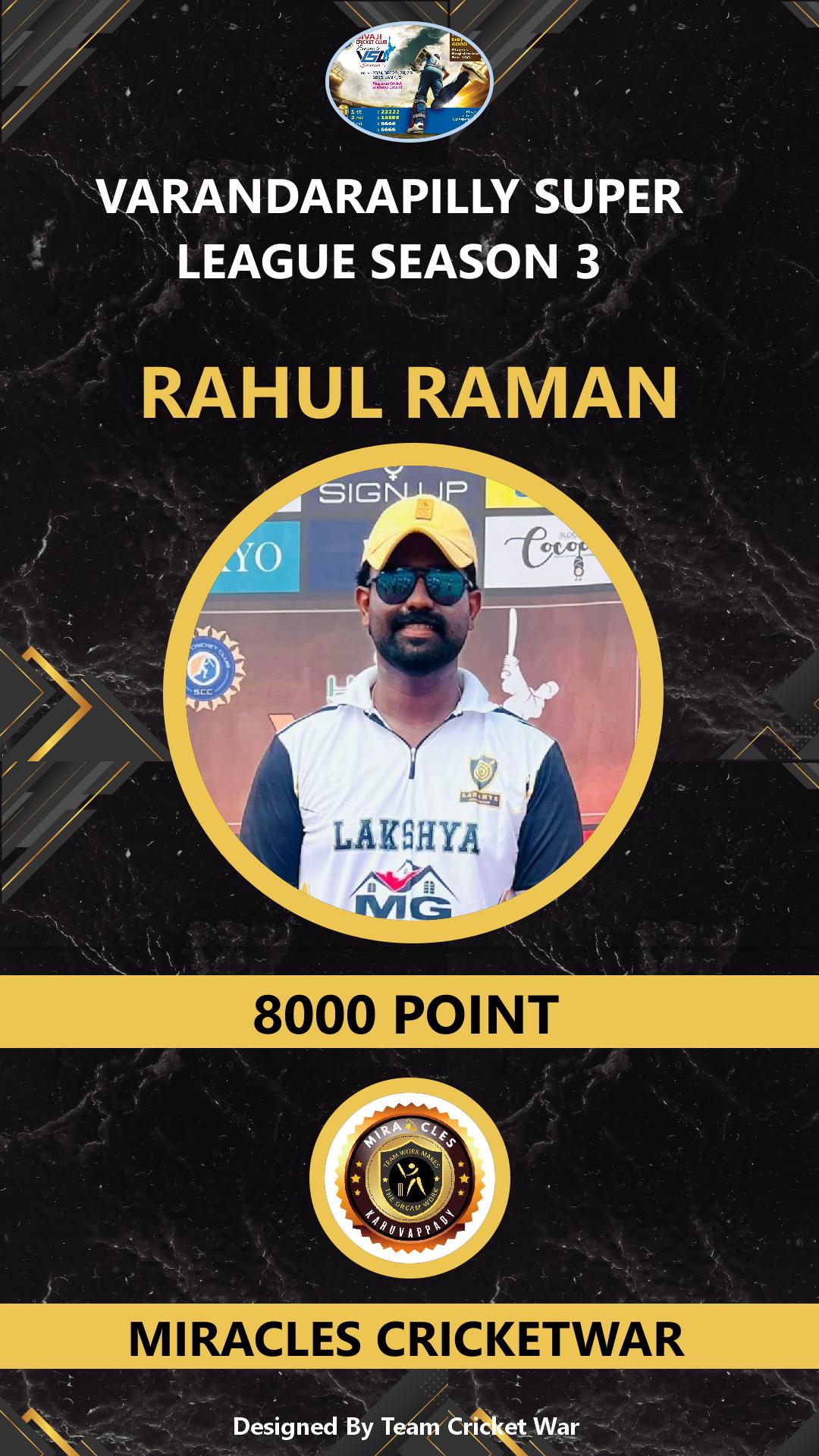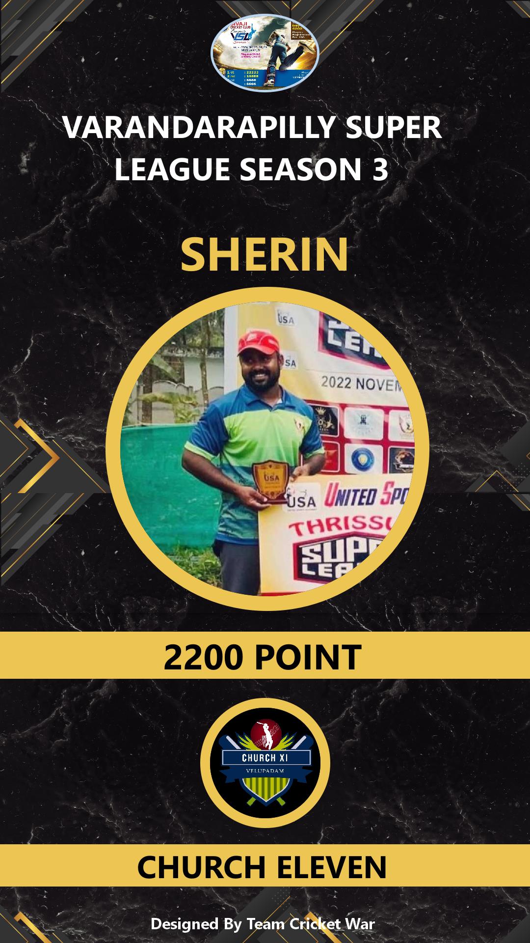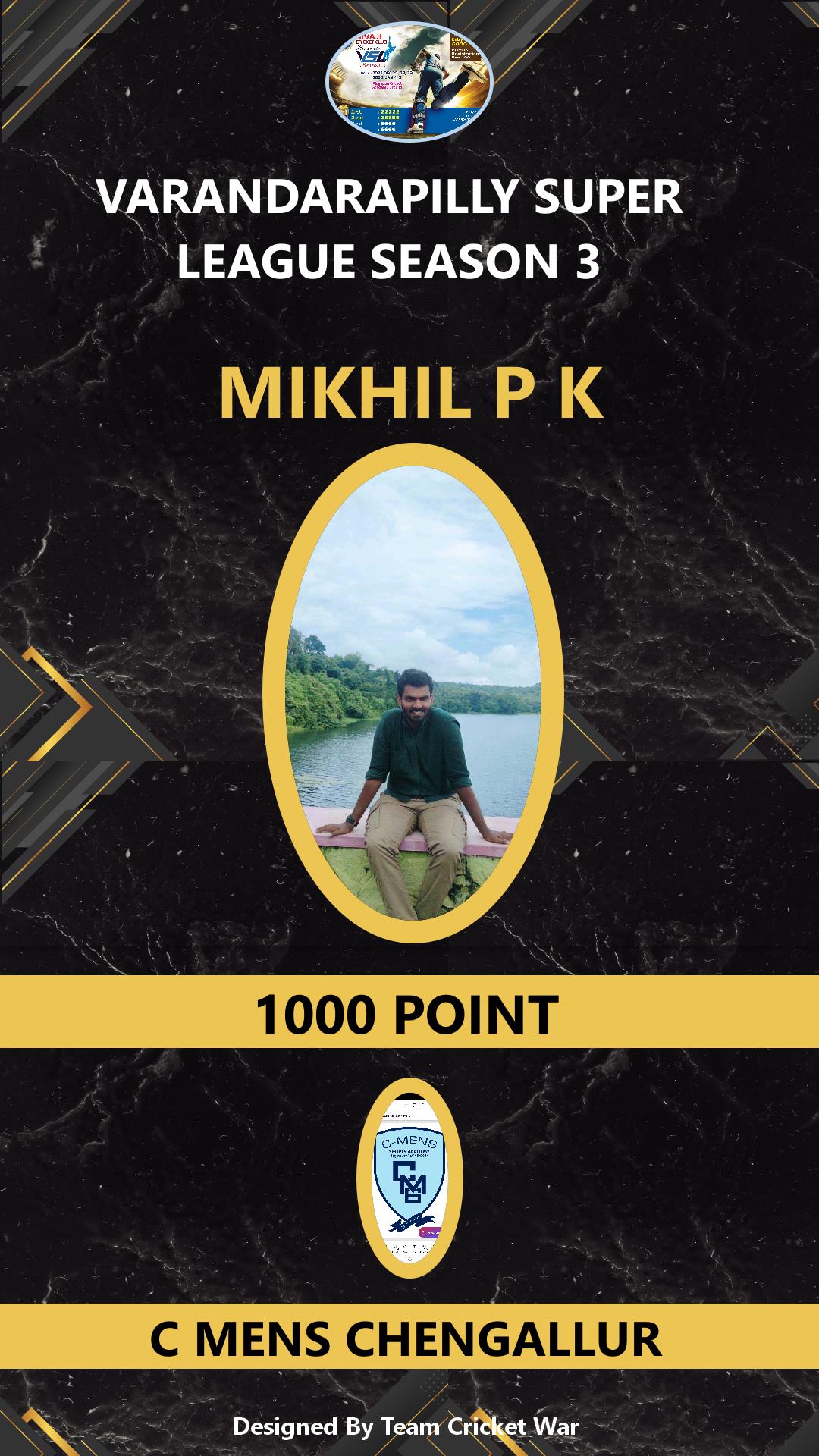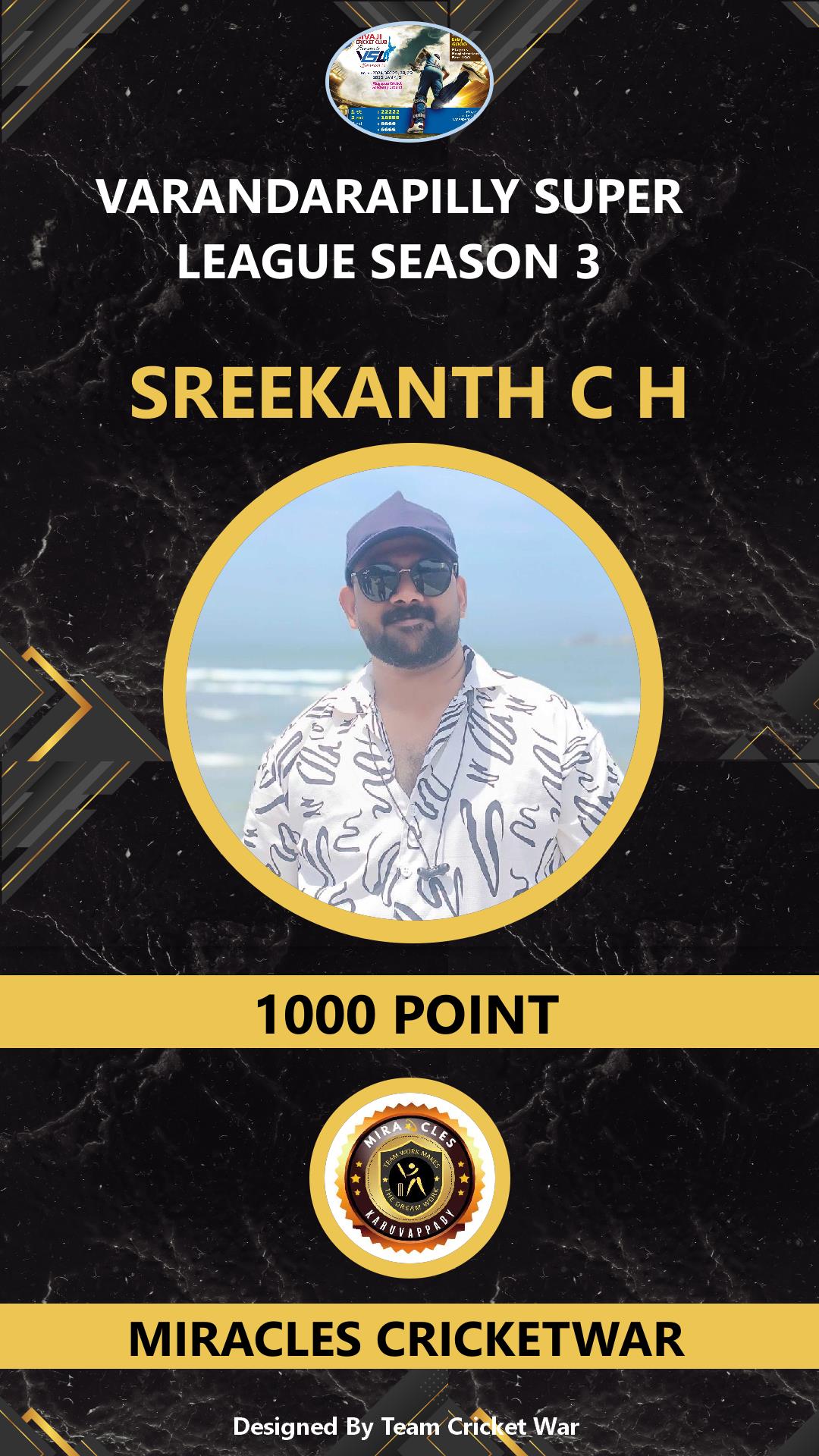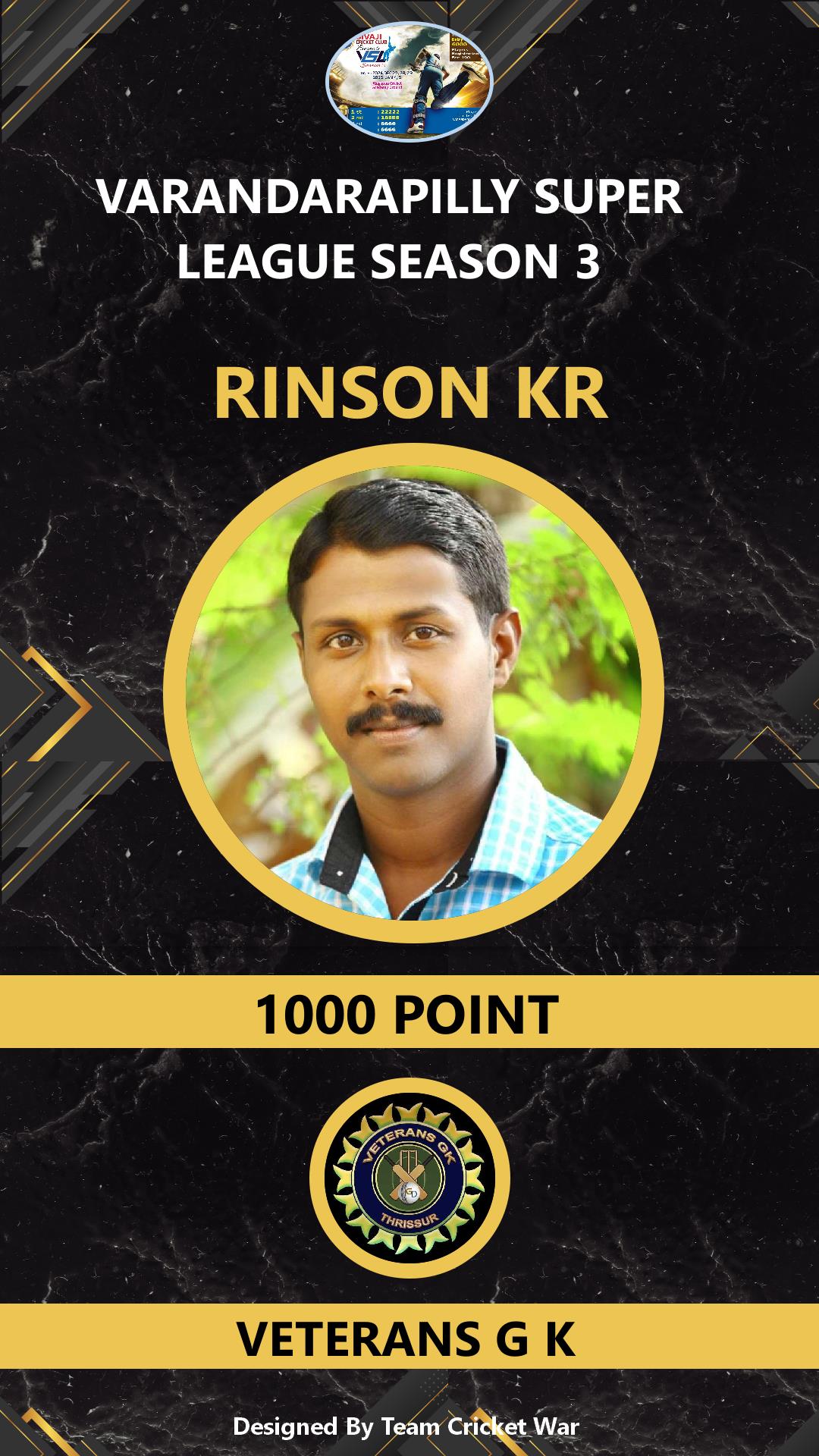 ALLROUNDER, AGE : 41 VARANDARAPPILLY Bid Amount : 2000 Team : MIRACLES CRICKETWAR Download ID Card VIEW PROFILE |