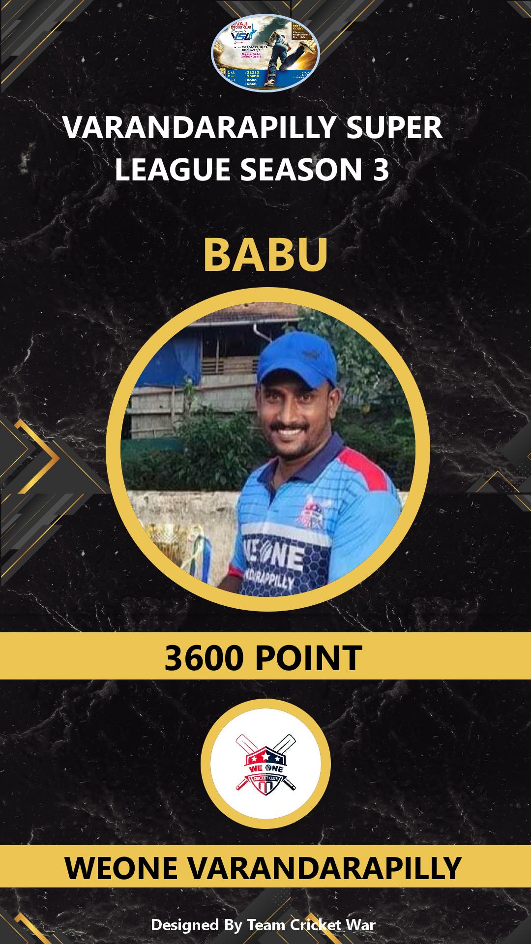ALLROUNDER, AGE : 37 VARANDARAPPILLY Bid Amount : 3600 Team : WEONE VARANDARAPILLY Download ID Card VIEW PROFILE |