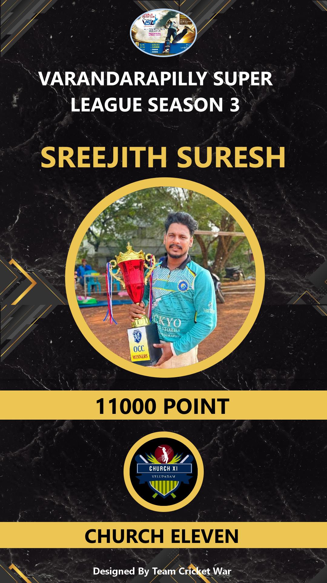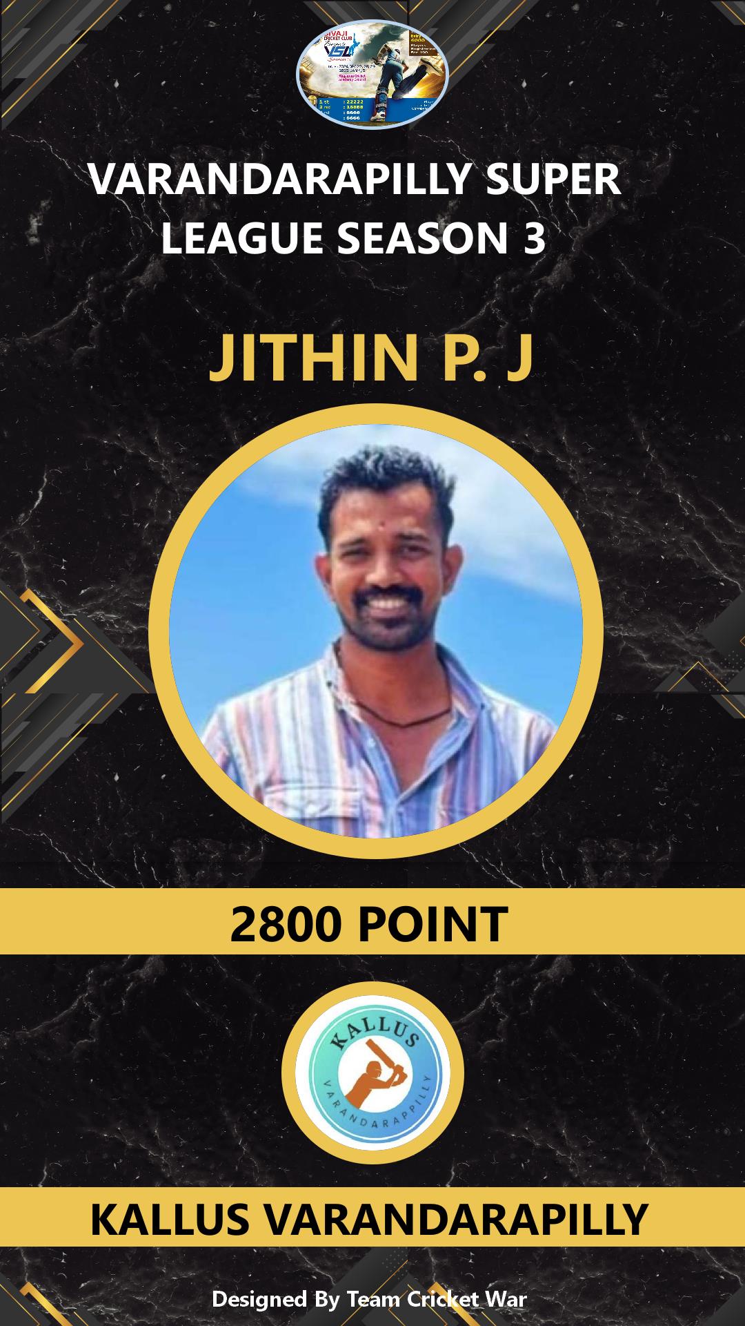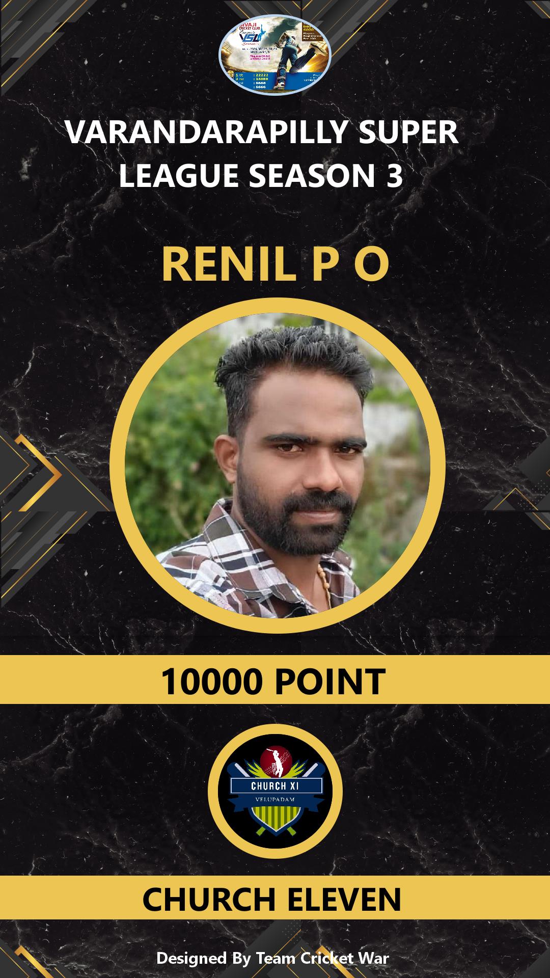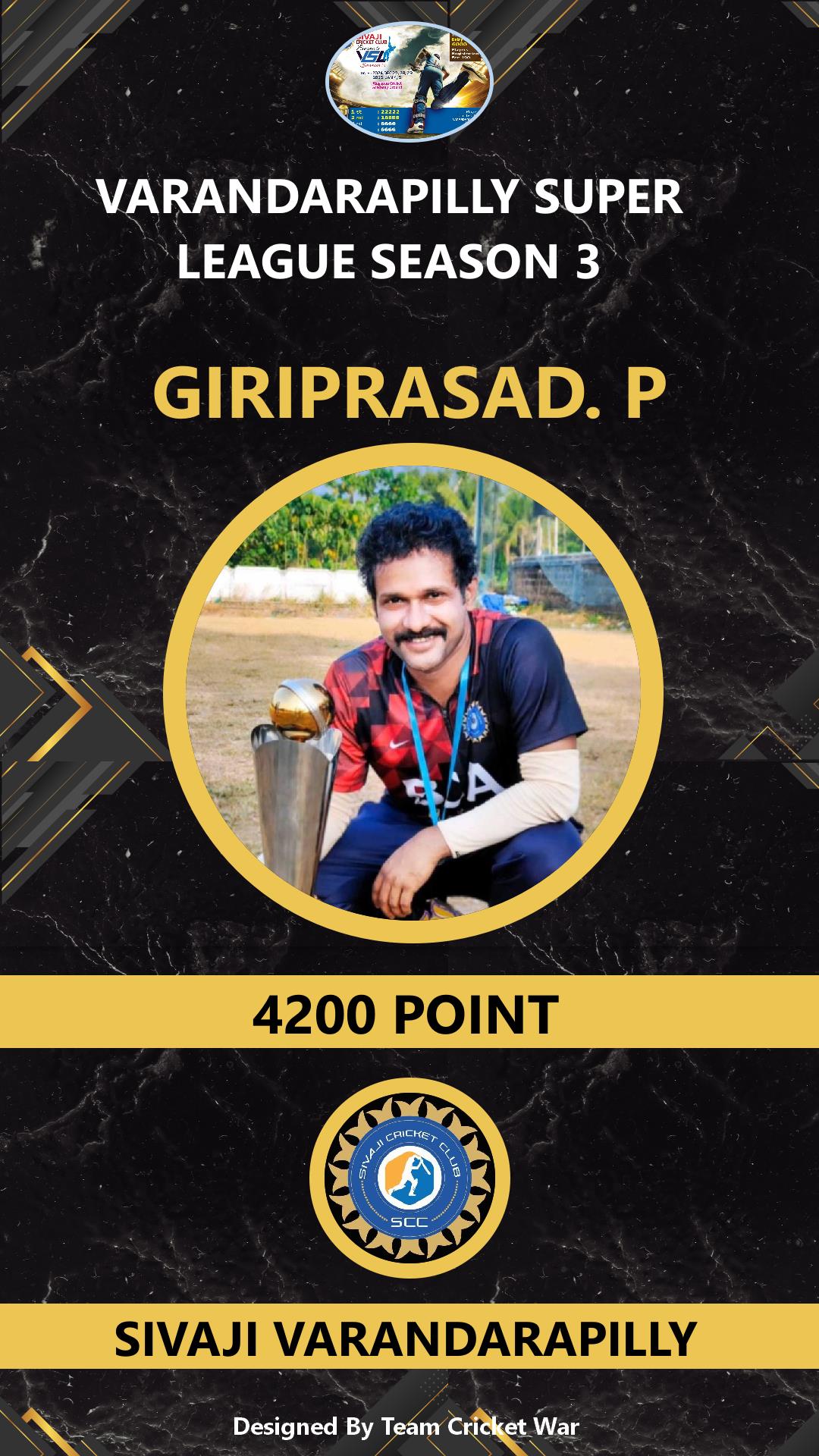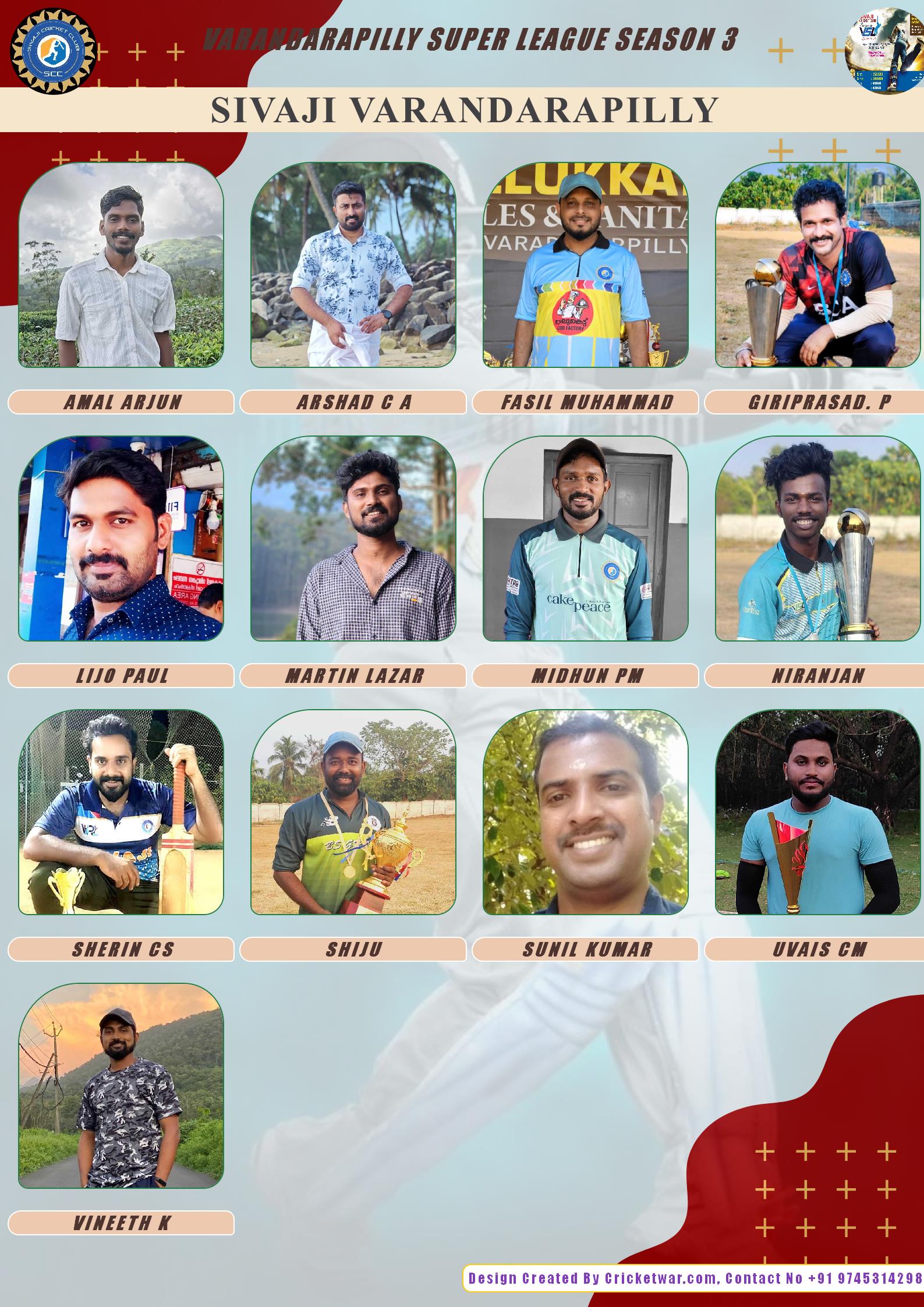ALLROUNDER, AGE : 32 VELUPADAM Bid Amount : 4200 Team : SIVAJI VARANDARAPILLY Download ID Card VIEW PROFILE |