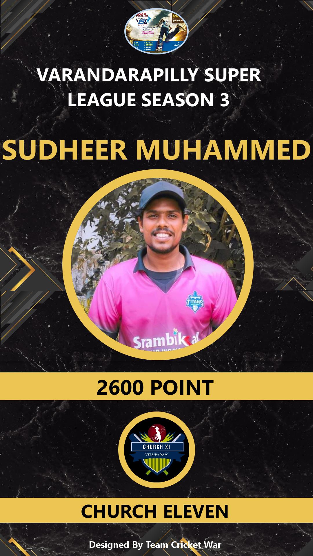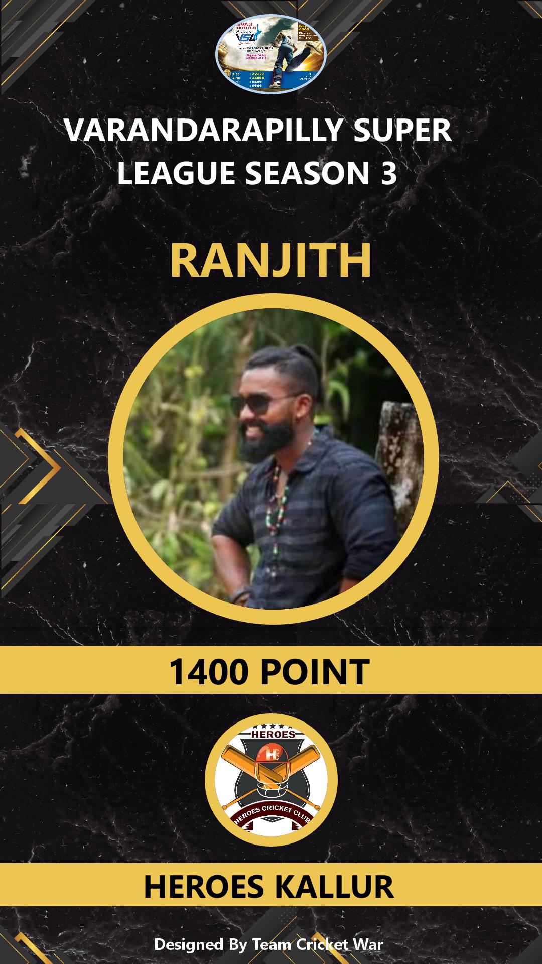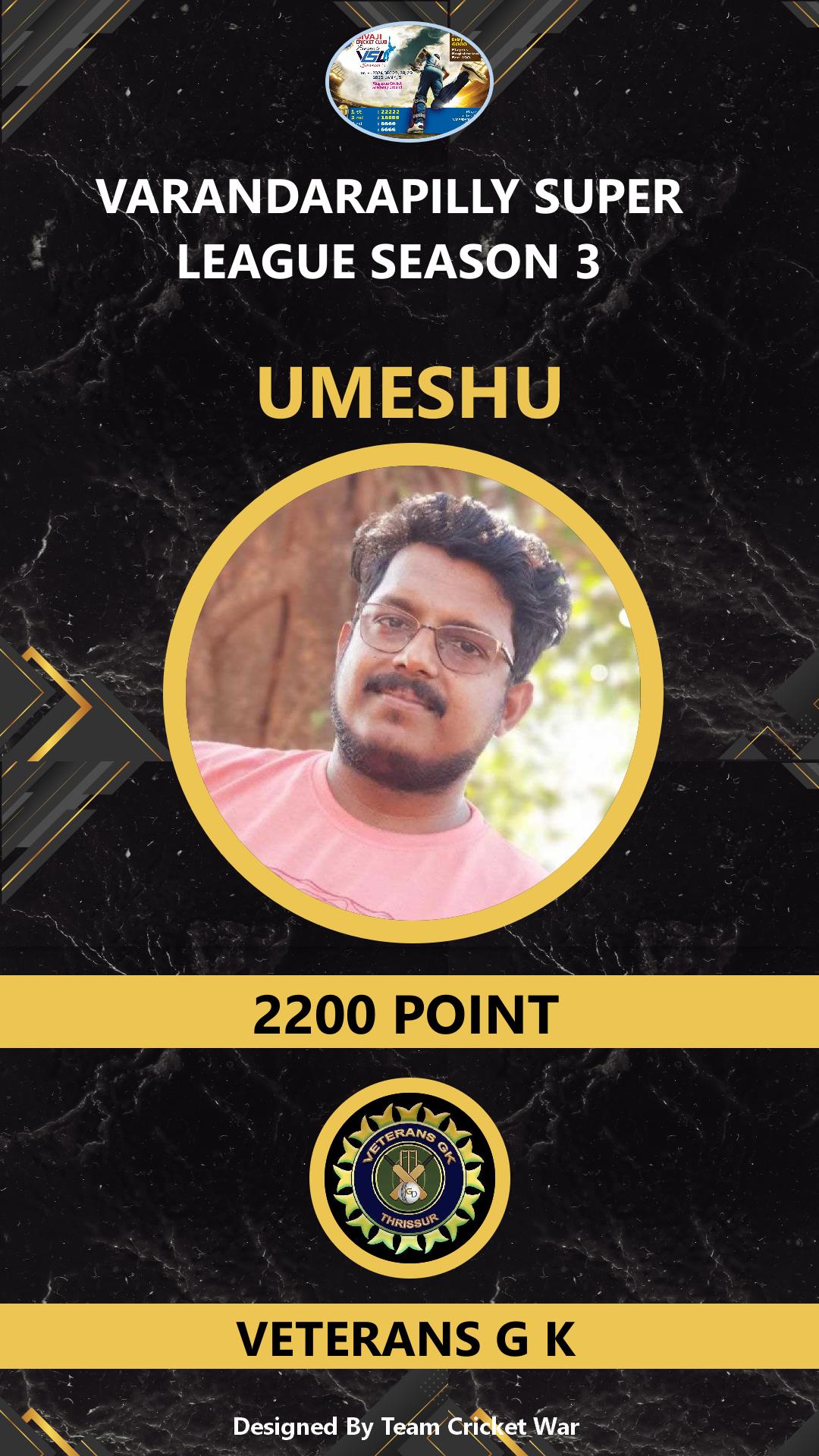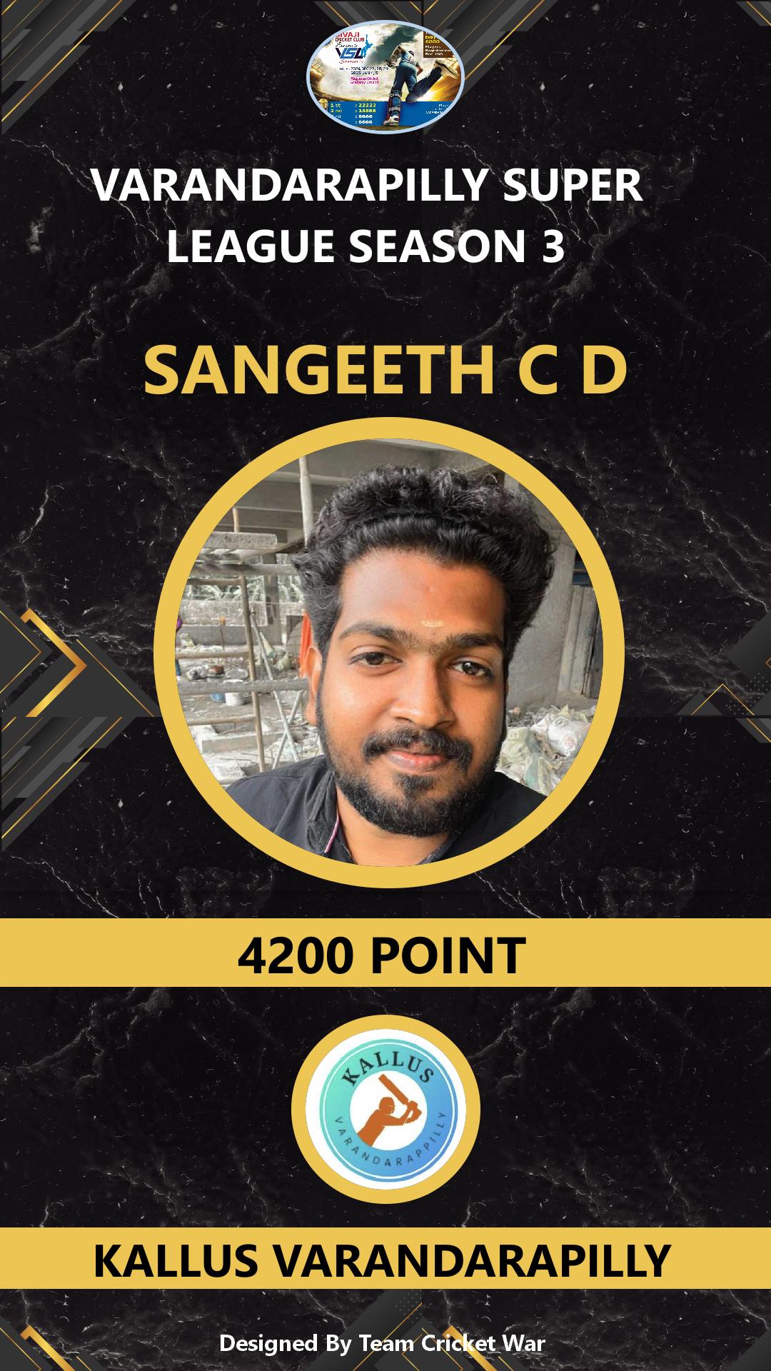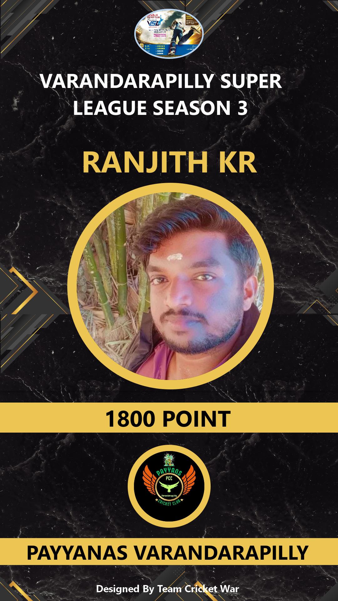 ALLROUNDER, AGE : 32 VELUPADAM Bid Amount : 4200 Team : SIVAJI VARANDARAPILLY Download ID Card VIEW PROFILE |