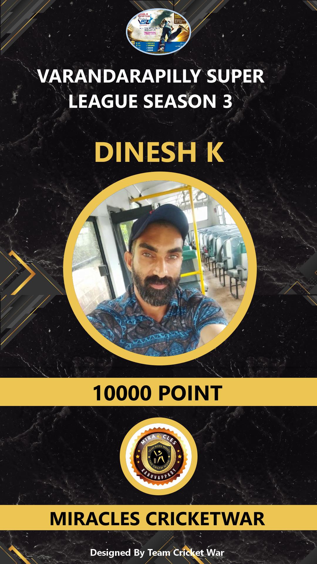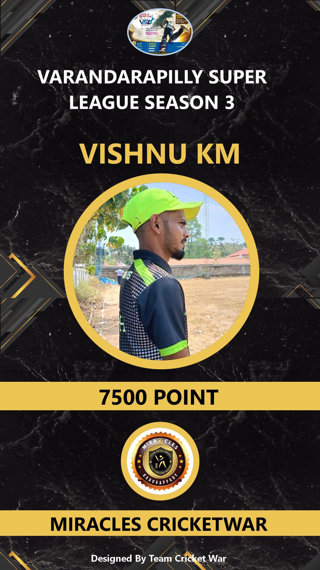 BOWLER, AGE : 33 MUPLIYAM Bid Amount : 6000 Team : MIRACLES CRICKETWAR Download ID Card VIEW PROFILE |