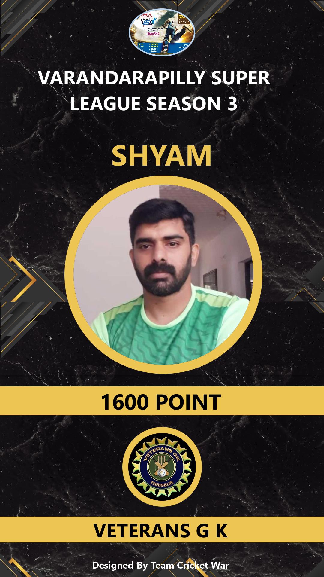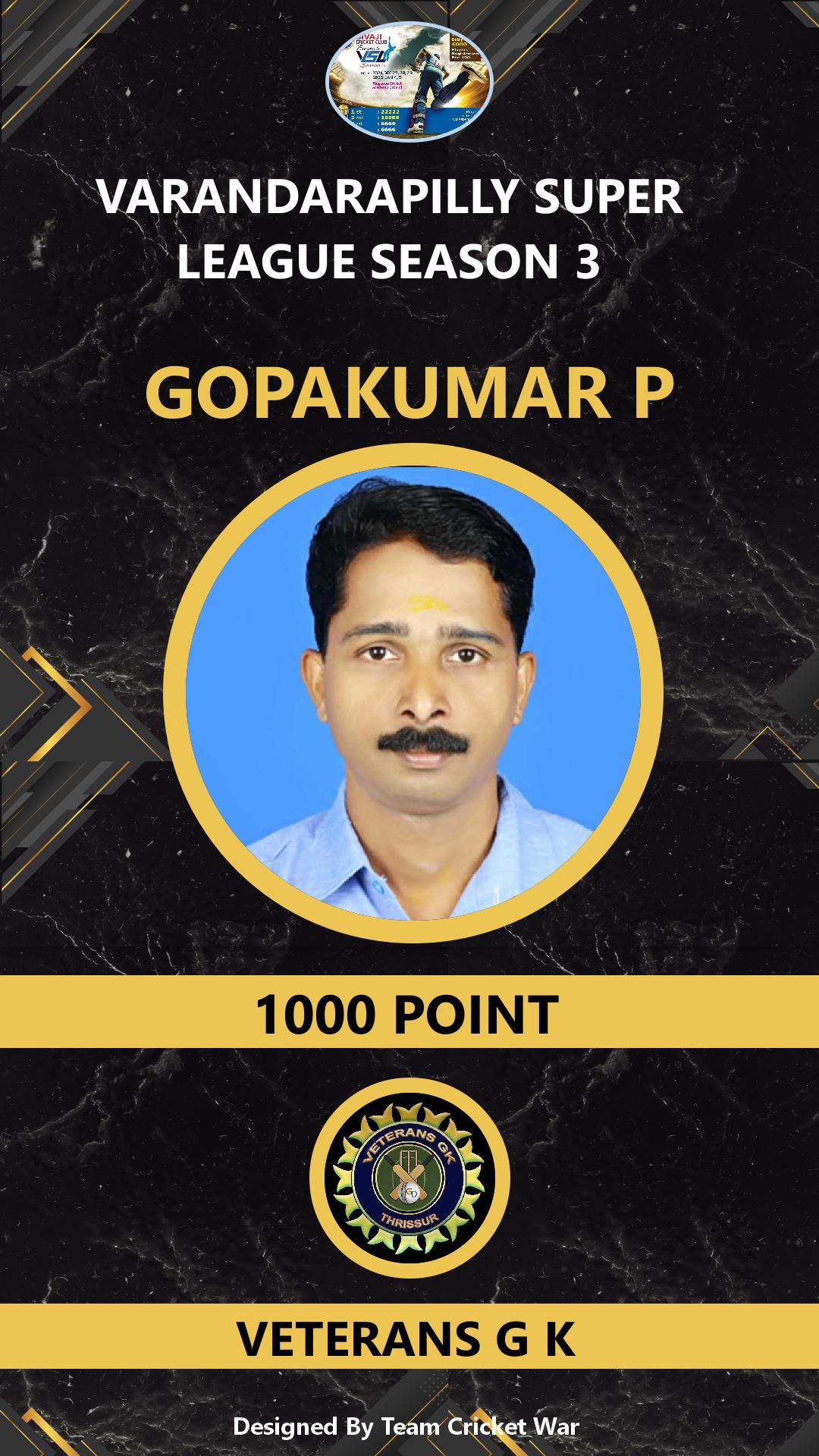 ALLROUNDER, AGE : 49 MUPLIYAM Bid Amount : 1000 Team : VETERANS G K Download ID Card VIEW PROFILE |