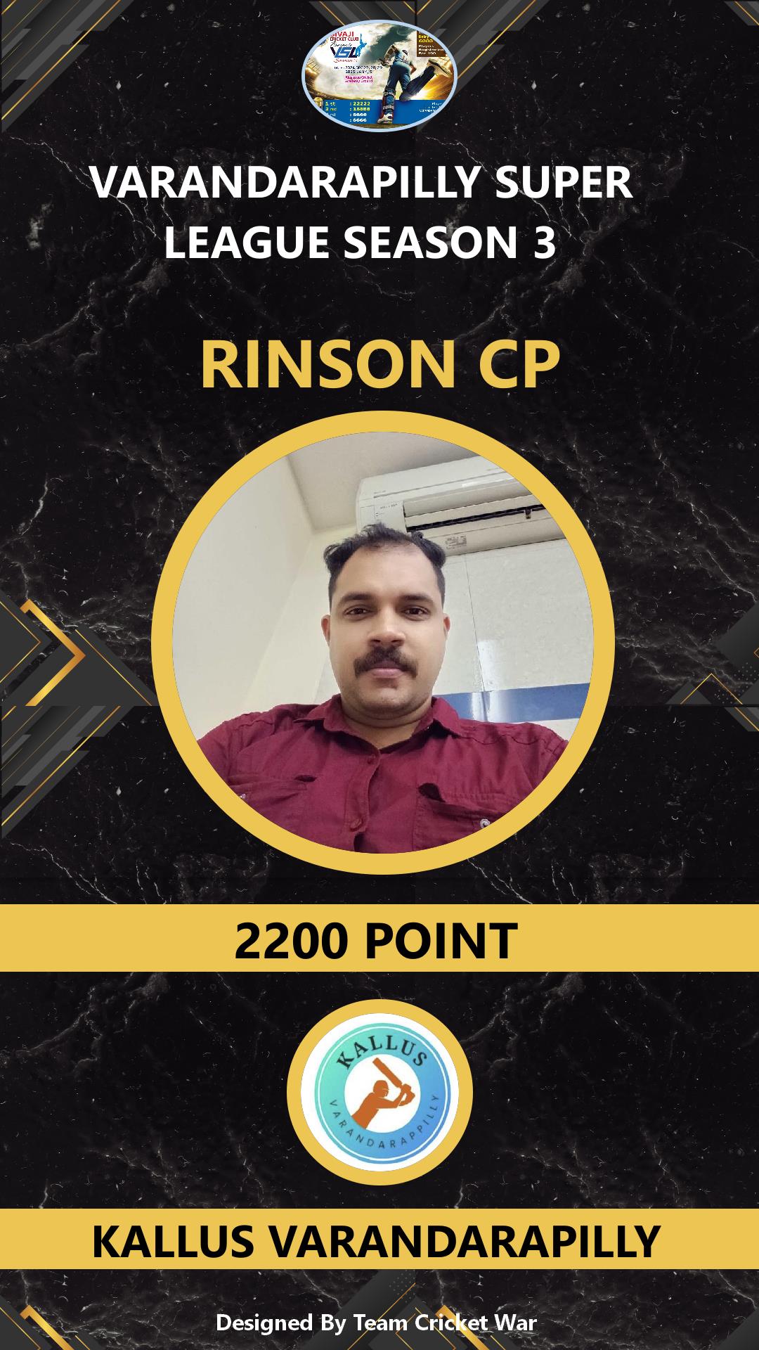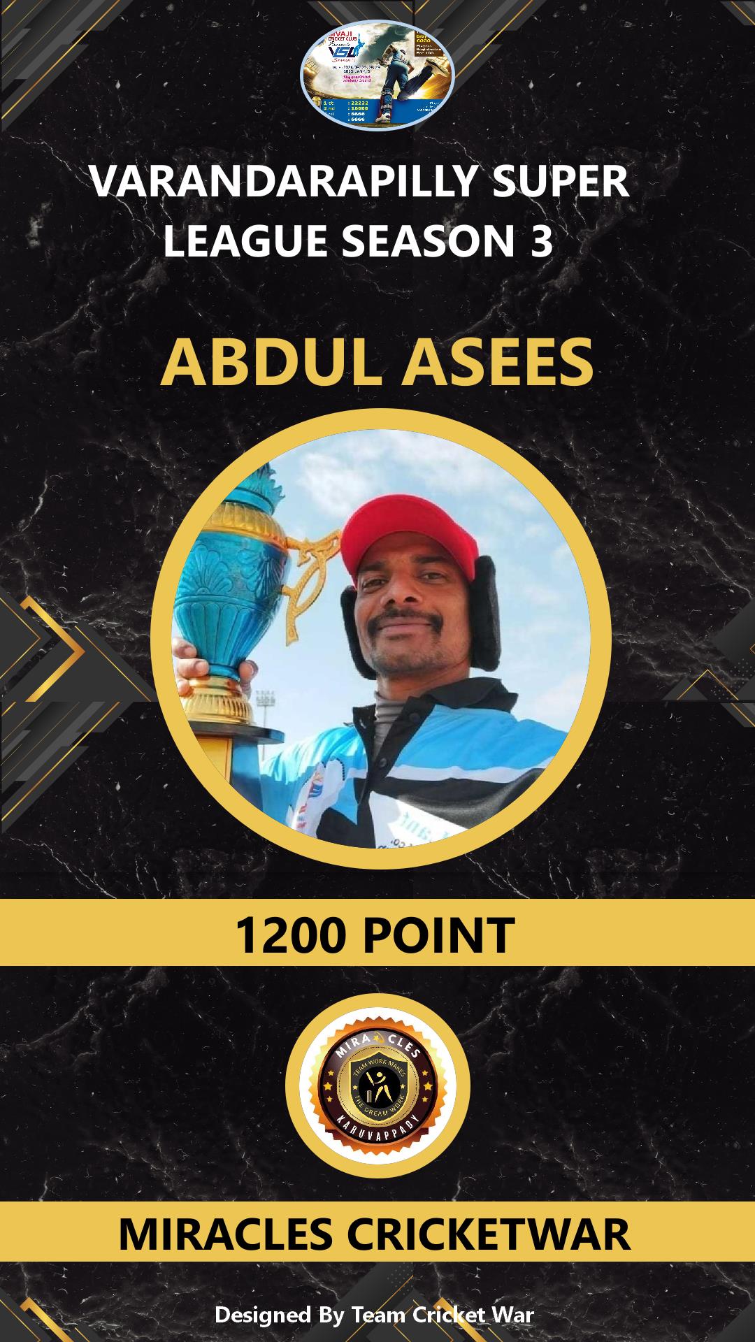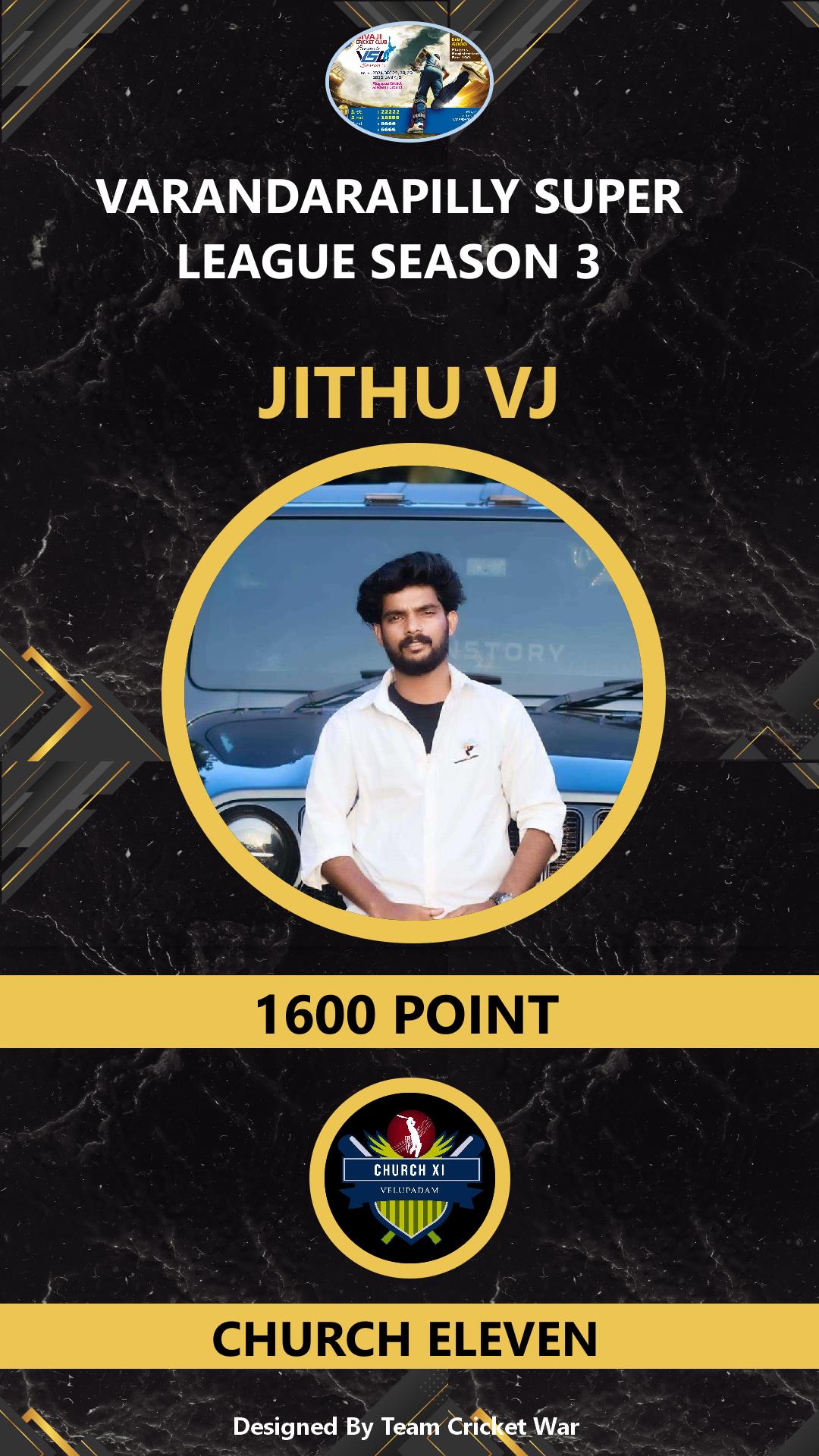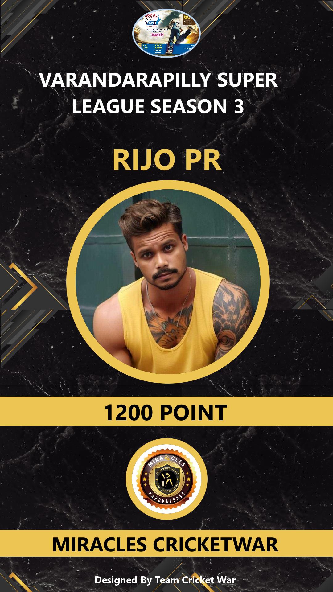 BOWLING ALLROUNDER, AGE : 38 VARANDARAPPILLY Bid Amount : 2200 Team : MIRACLES CRICKETWAR Download ID Card VIEW PROFILE |