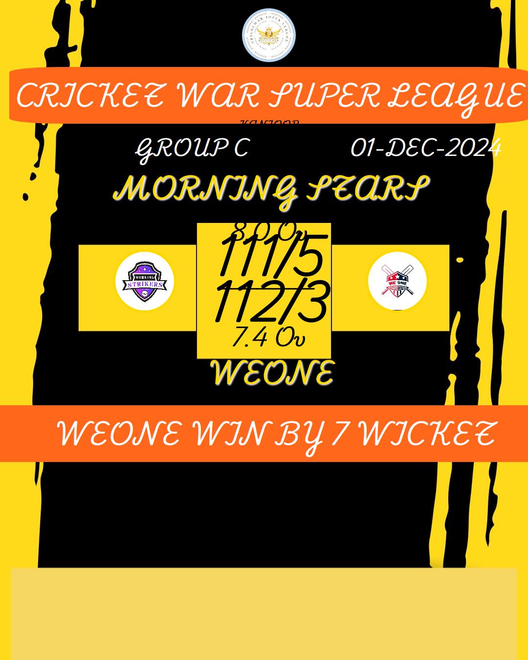 WEONE WIN BY 7 WICKET