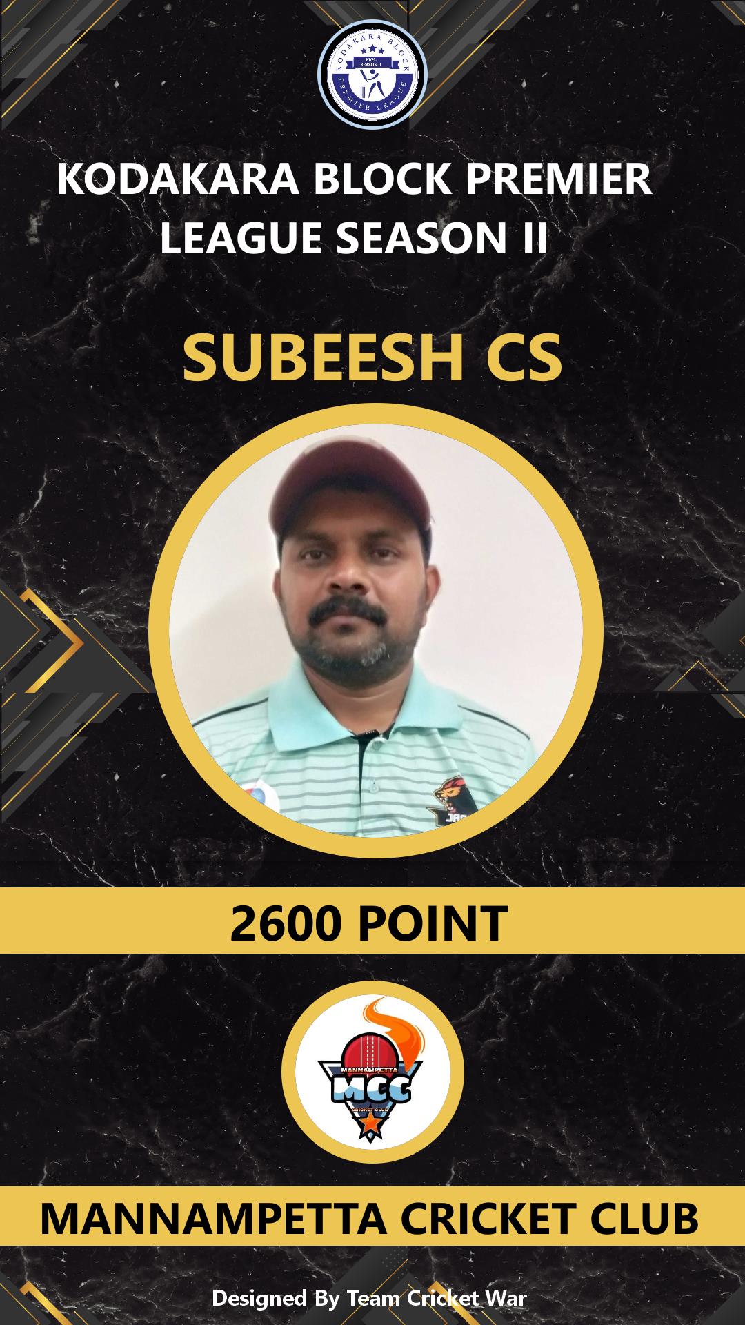ALLROUNDER, AGE : 43 VPLY Bid Amount : 2600 Team : MANNAMPETTA CRICKET CLUB Download ID Card VIEW PROFILE |