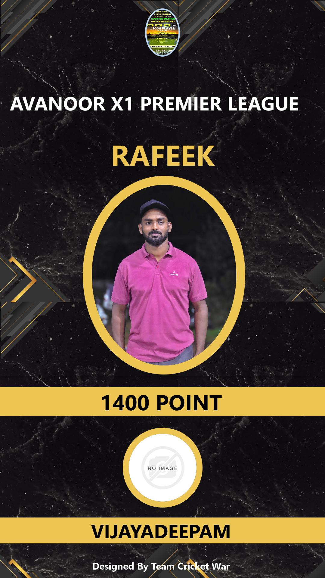BATSMAN, AGE : 28 WADAKANJERY Bid Amount : 1400 Team : VIJAYADEEPAM Download ID Card VIEW PROFILE |