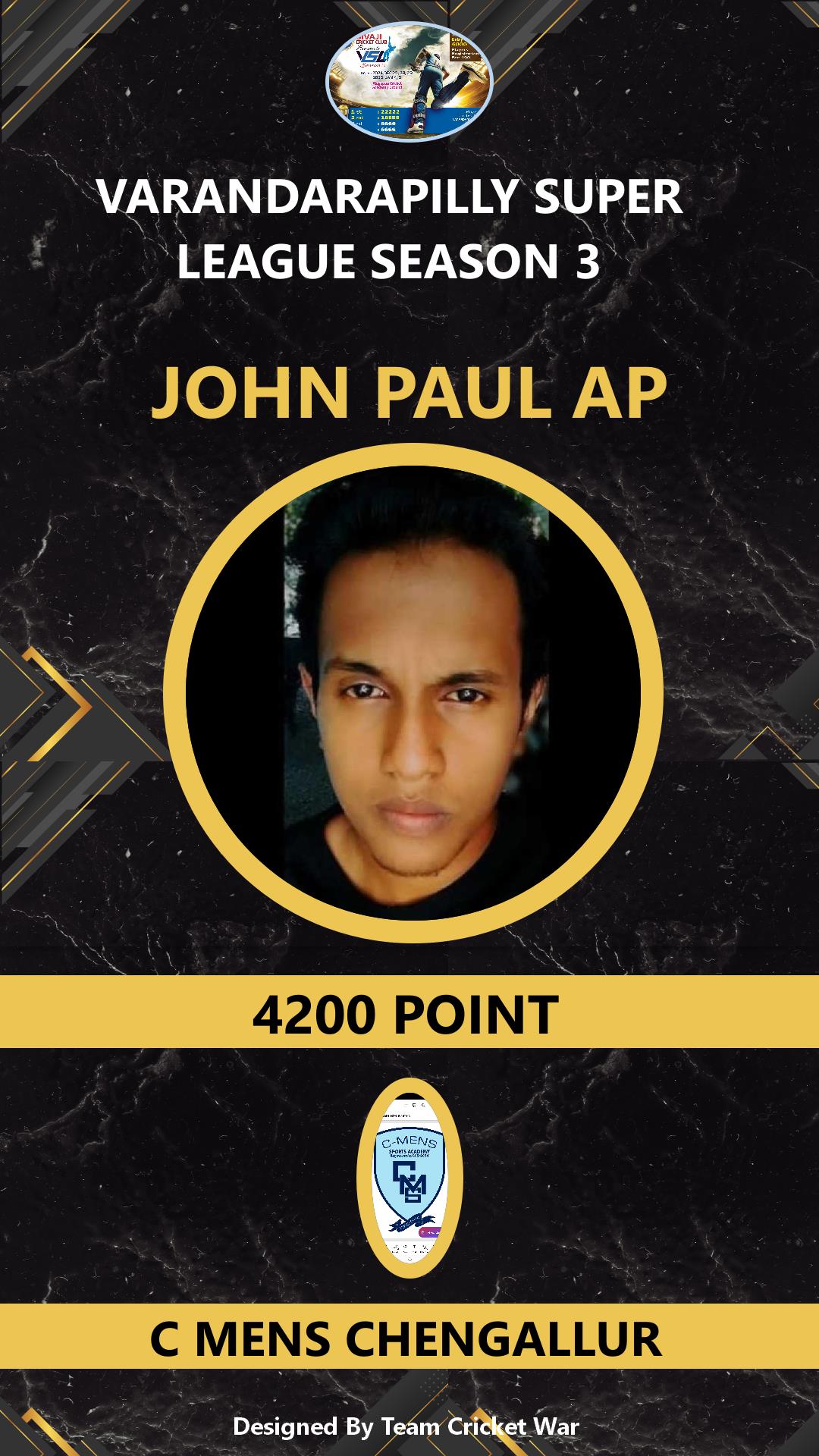 ALLROUNDER, AGE : 34 VARANDARAPPILLY Bid Amount : 2800 Team : PAYYANAS VARANDARAPILLY Download ID Card VIEW PROFILE |