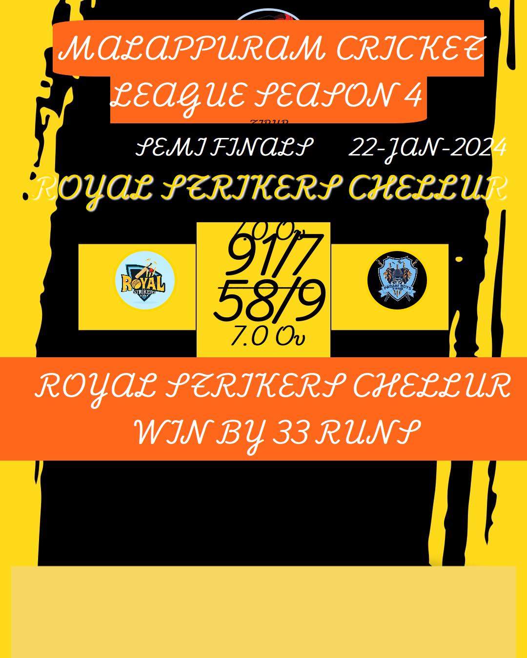 ROYAL STRIKERS CHELLUR WIN BY 33 RUNS